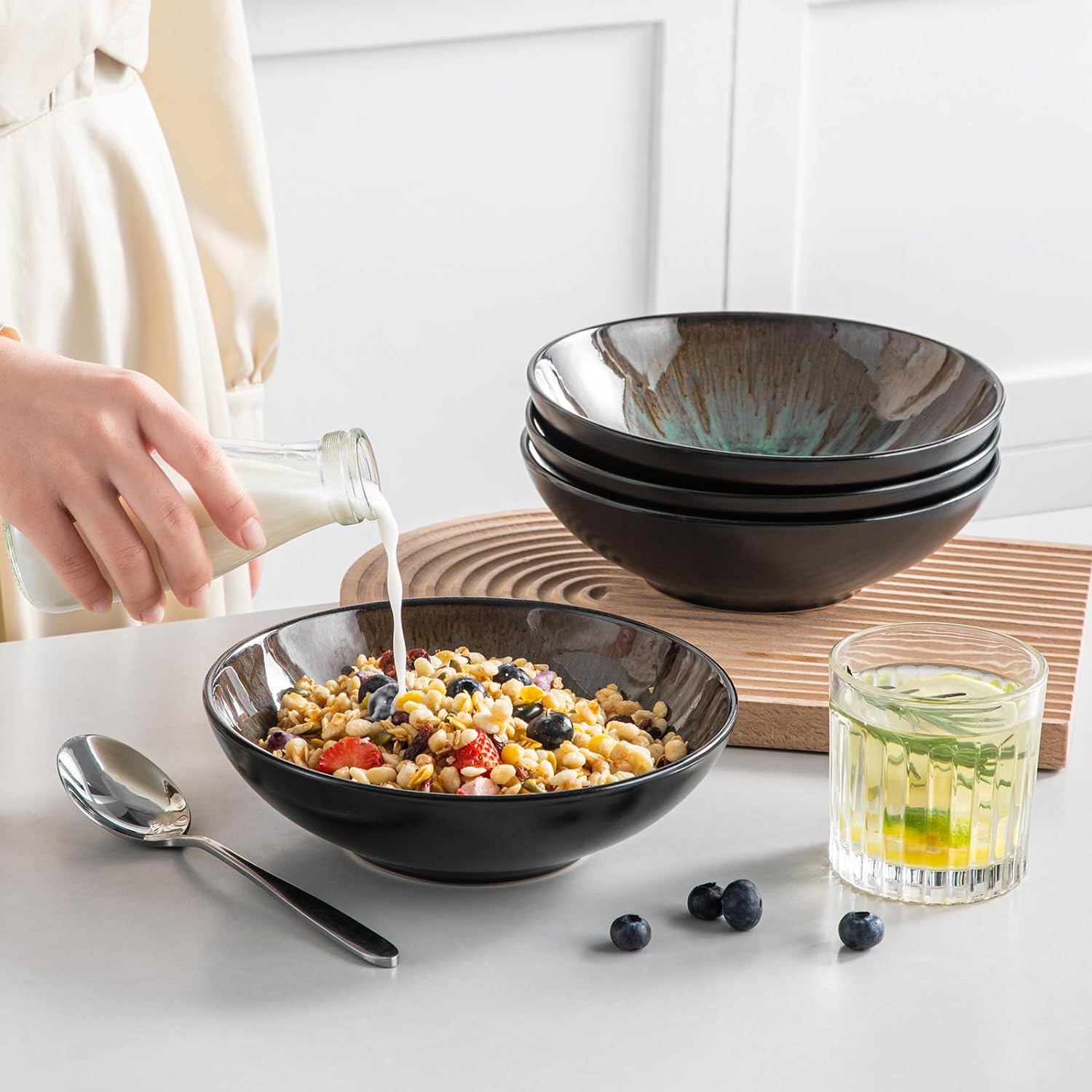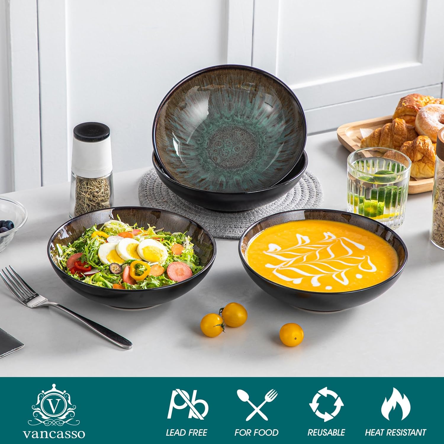 【Unique and Beautiful Glaze】✅Reactive glaze inside, matte glaze outside, the unusual glazed craftmanship contrast with the mottled green, make your table glamorous and add a touch of style to your dishes. ✅The glaze is smooth and glossy, each piece is slightly different from others, full of artistic beauty.✅Add plump black rim design which enrich the vision appeal and harmony.