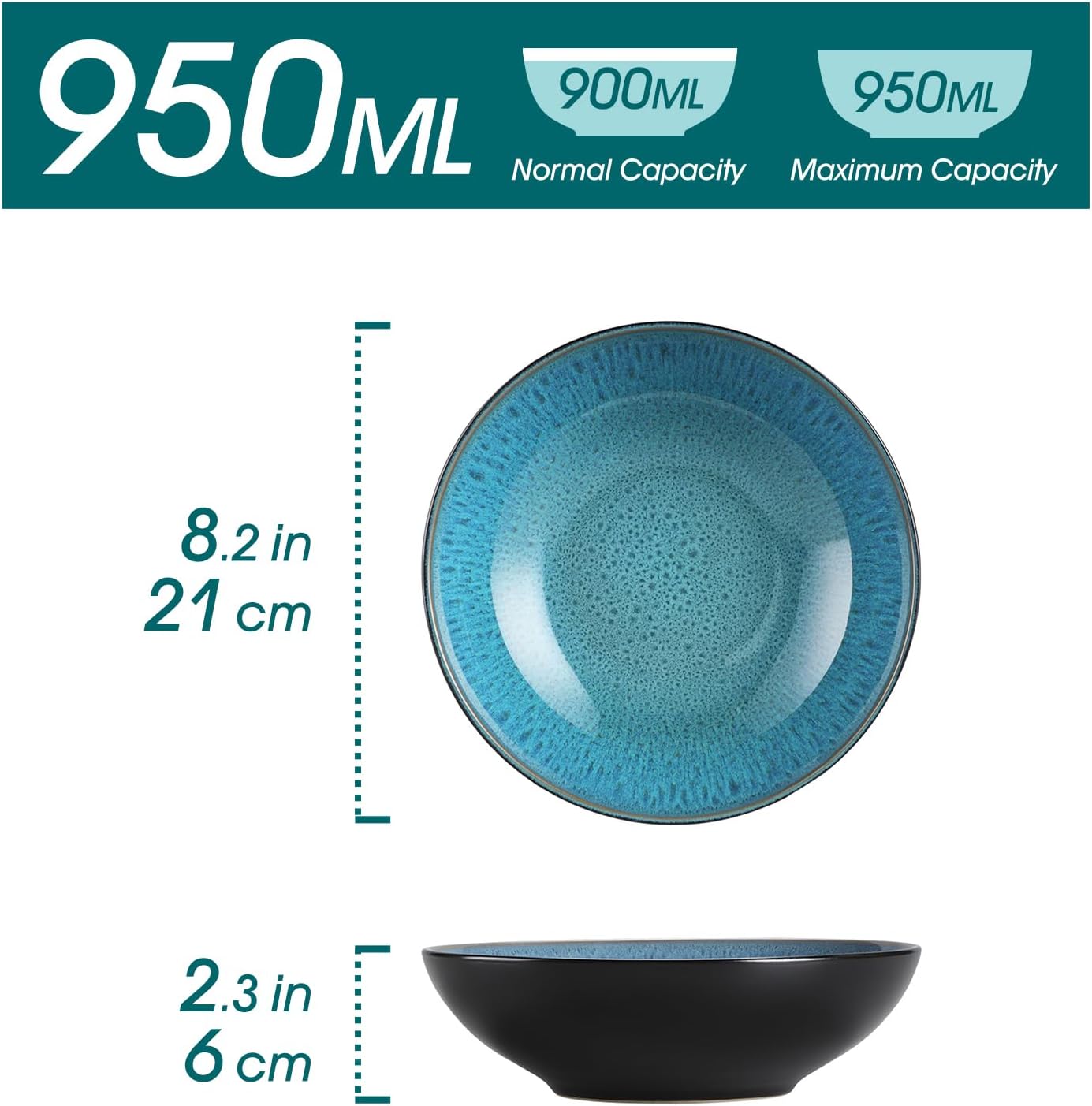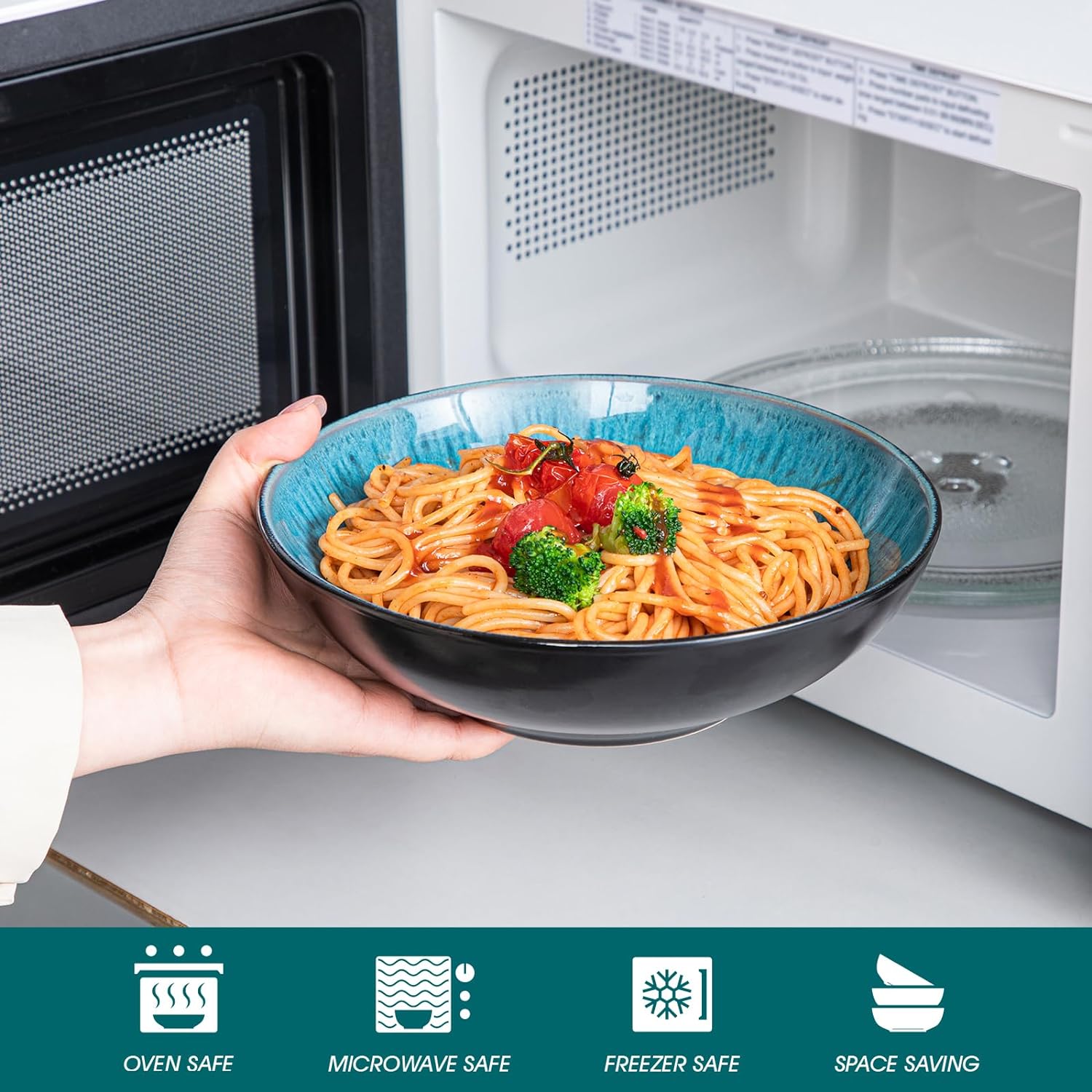 【Big Capacity of 950ml】Diameter 21cm, deep 6cm, 32oz. These pasta bowls very wide and deep, enough for ramen, soup, pasta, cereal, salad and breakfast. The bowls feel strong but not too thick, can survive multiple cycles of the dishwasher, heating in microwave and daily use.