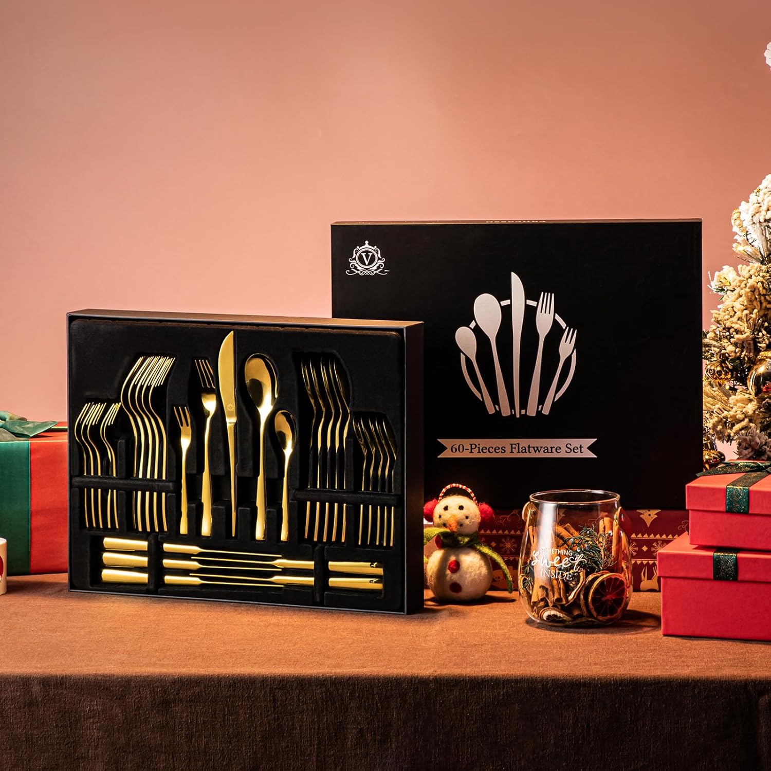 vancasso Cutlery Set, Gold Cutlery Set for 12 People, 60 Piece Tableware Cutlery Set for Home Restaurant Party, Cutlery Include Dinner Forks/Spoons/Knives, Square Edge & Mirror Polished