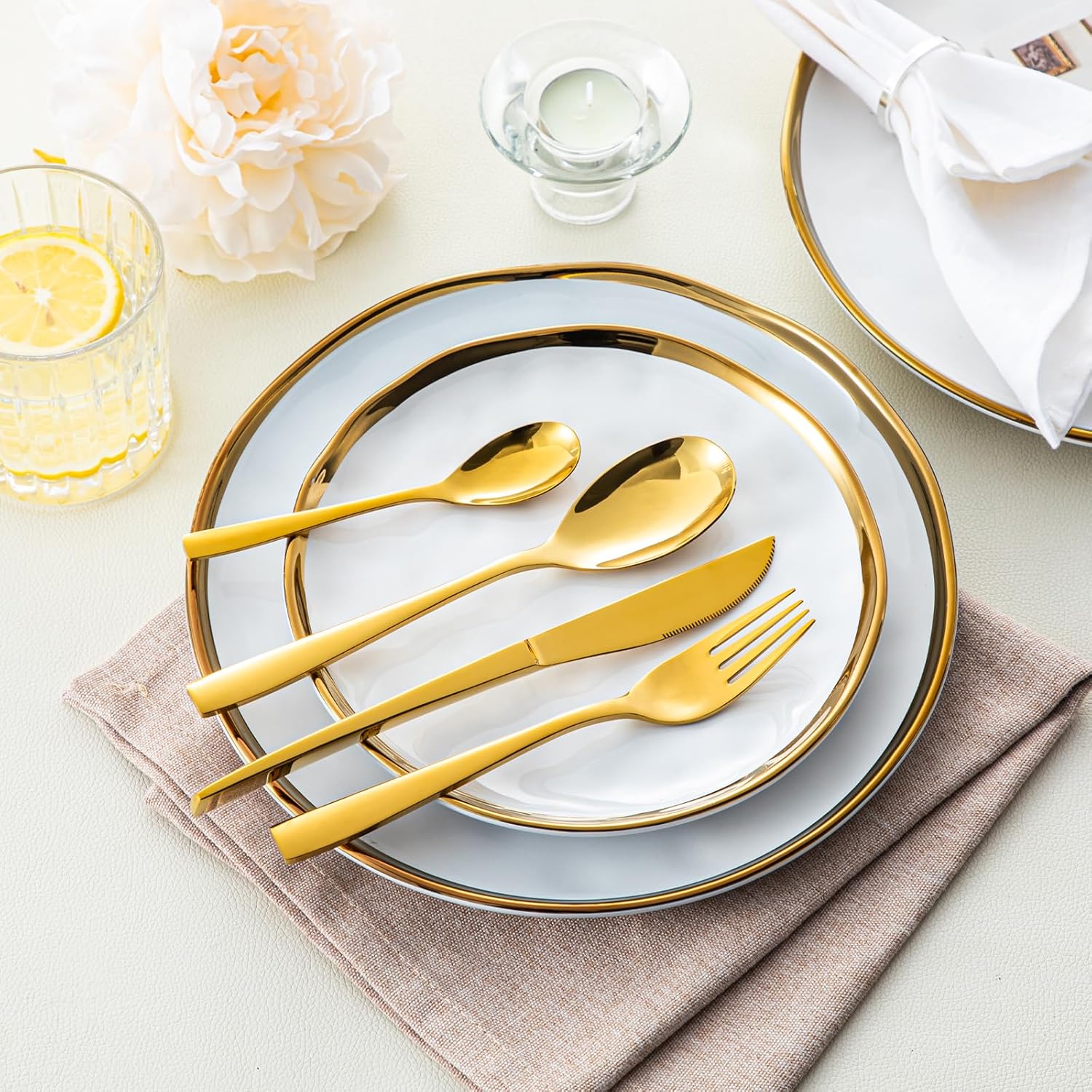 𝐇𝐢𝐠𝐡 𝐐𝐮𝐚𝐥𝐢𝐭𝐲 𝐌𝐚𝐭𝐞𝐫𝐢𝐚𝐥 – This Gold cutlery set made of premium 18/0 stainless steel, rust resistant and durable for years, shiny mirror polished finish and titanium plating, don’t worry the color fading or peel off. Our stainless steel cutlery set will not bend, break, or get damaged by heat. The solid and durable construction will perfectly prevent the utensils from snapping even when used for hard applications. Hand washing is recommended first, dry them before storing.