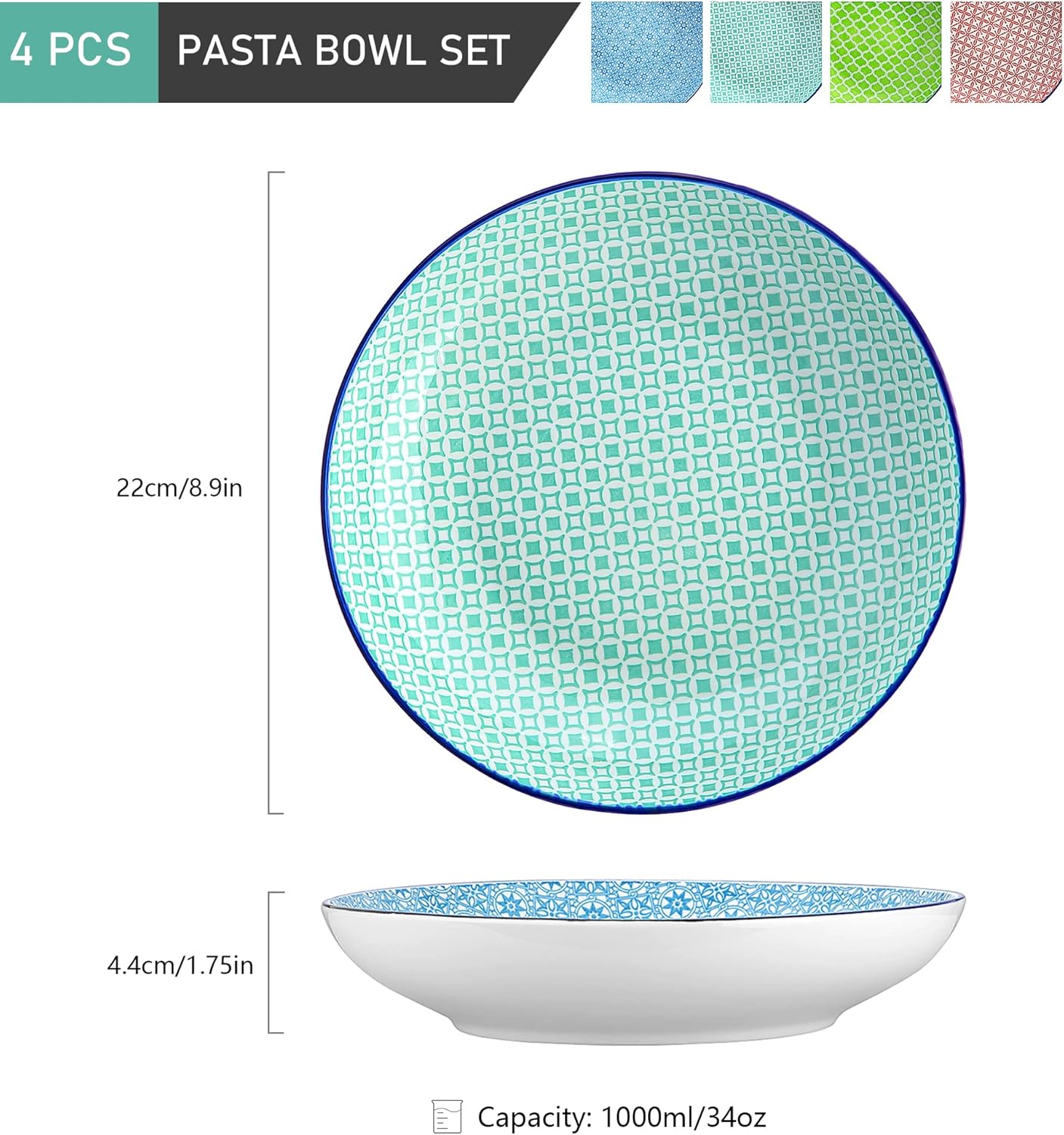 【BIG CAPACITY OF 34 Ounce】- Diameter 22cm, deep 4.4cm, 1000ml. These pasta bowls are deep enough for ramen, soup, pasta, cereal, salad and breakfast. The bowls feel strong but not too thick, can survive multiple cycles of the dishwasher, heating in microwave and daily use.