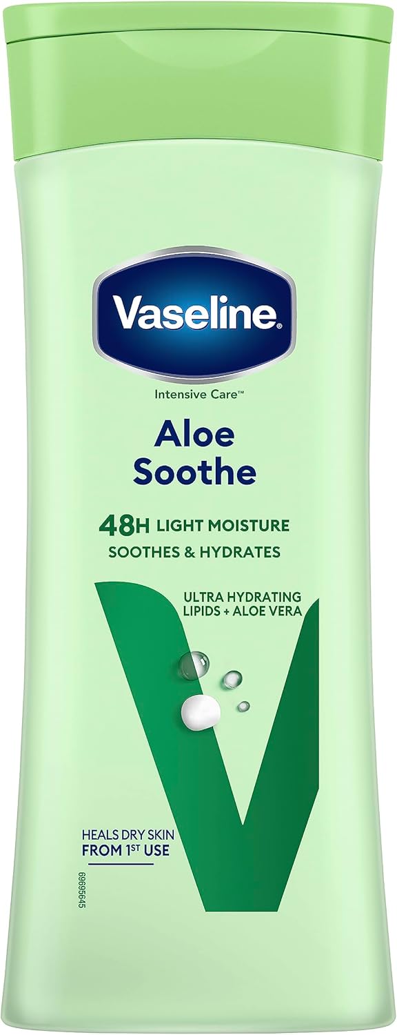 Vaseline Aloe Soothe body lotion contains micro-droplets of Vaseline Jelly to lock in moisture to provide deep healing skin care