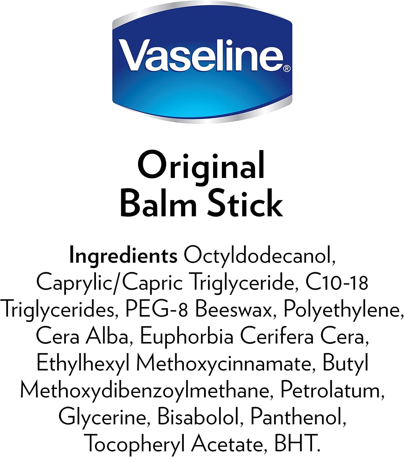Product Description Vaseline Lip therapy original sticks instantly softens and soothes, helping to repair – not just coat – your lip barrier. Made with Vaseline Petroleum jelly, it locks in moisture for beautiful, healthy-looking lips. The skin on your lips is thinner than other parts of your body, so it loses moisture faster, making it prone to becoming dry and dull. Best for chapped lips, dry skin. Ingredients Octyldodecanol, Caprylic/Capric triglyceride, C10-18 triglycerides, PEG-8 beeswax, Polyethylene, cera alba, Euphorbia Cerifera Cera, Ethylhexyl Methoxycinnamate, BUTYL METHOXYDIBENZOYLMETHANE, petrolatum, Glycerin, Bisabolol, Panthenol, Tocopheryl Acetate Safety Warning CAUTION: do not apply to irritated or damaged skin. Stop use if irritation develops. As we are always looking to improve our products, Our formulations change from time to time, so please always check the product packaging before use.