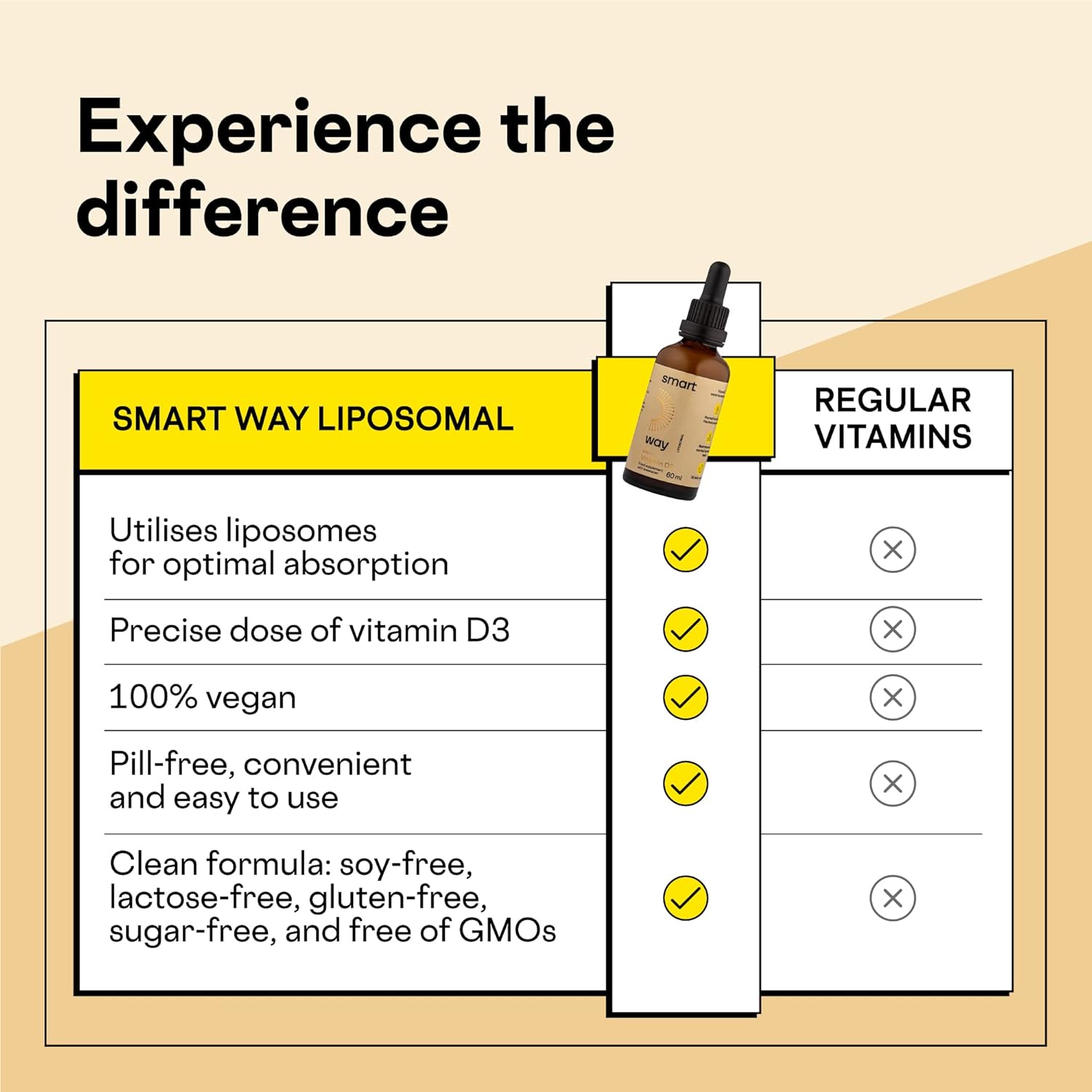 THE LAST THING YOU WANT is a Vitamin D supplement that DOESN’T DO ANYTHING to actually INCREASE your Vitamin D levels. Smart Way liposomal Vitamin D drops is FORMULATED DIFFERENTLY than the average Vit D supplement gummies, capsules & tablets. SUPERIOR LIPOSOMAL TECHNOLOGY specially designed for a OPTIMAL NUTRIENT DELIVERY and uptake in the body, and NO RISK OF MALABSORPTION.