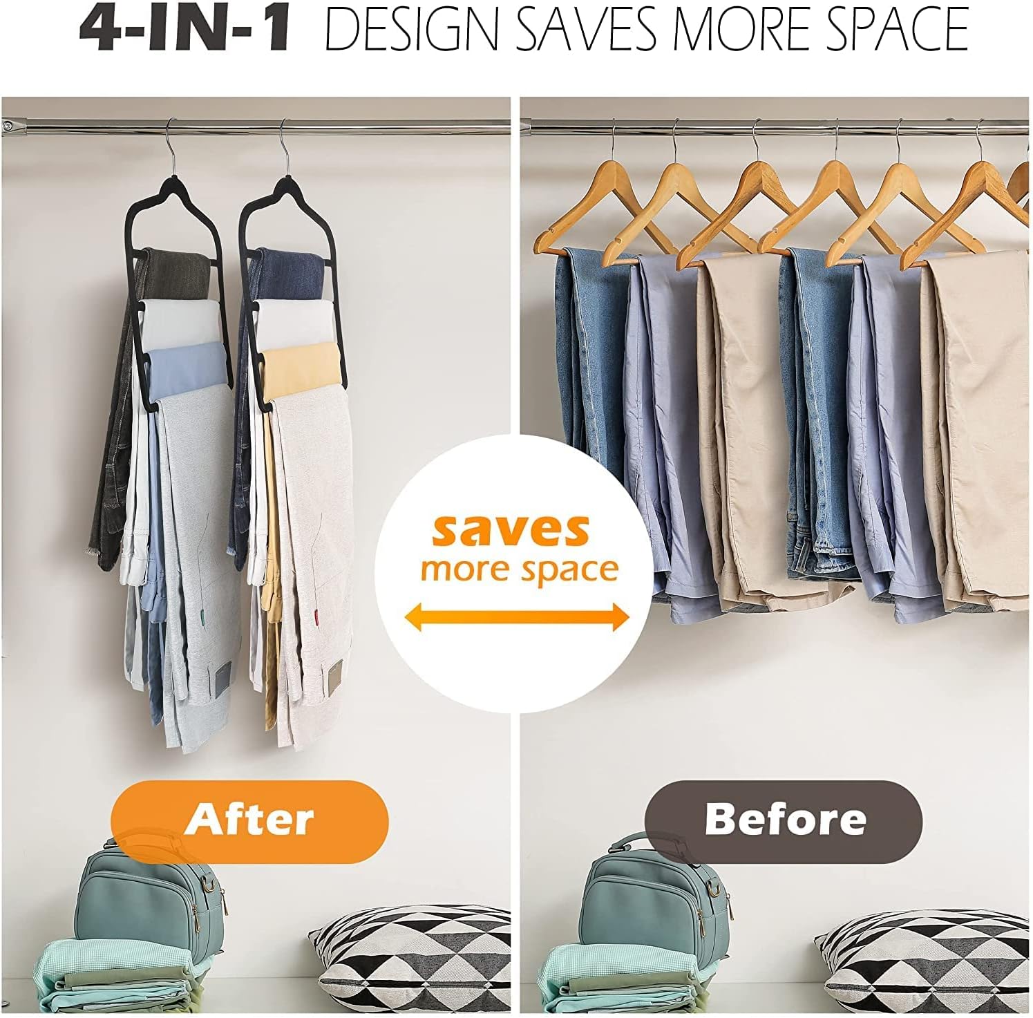 ✅【Space Saving Clothes Hanger】4 tier pant hanger. Each hanger can hold 4 pairs of pants, jeans, or slacks, save more closet space, and keep your closet more tidy and clean. Especially when the season changes, allowing you to store more clothes.