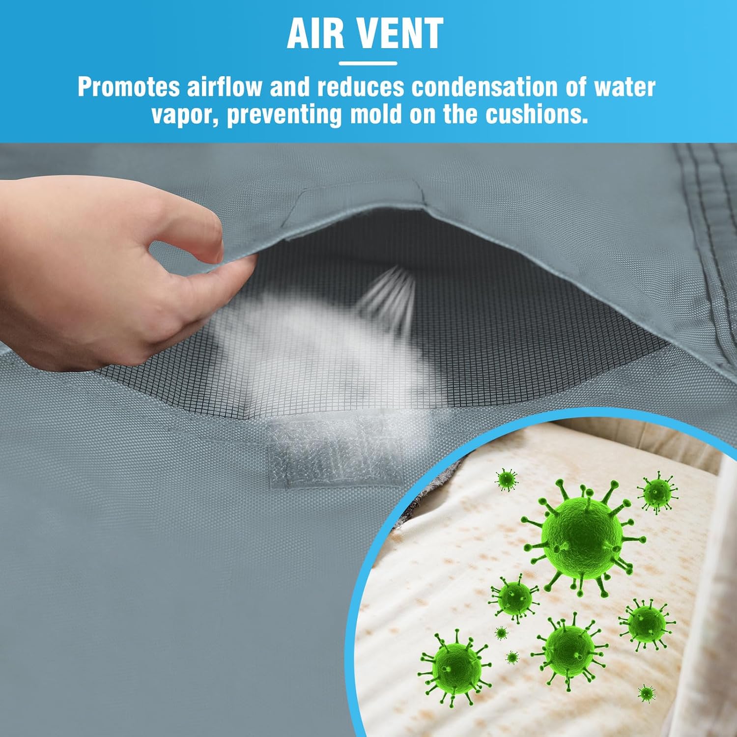 【Improved Ventilation for Mold Prevention】The air vent in front of the outdoor table cover is designed to keep air circulation, reducing condensation and preventing mold growth. To prevent water accumulation on rainy days, we suggest place a cushion under the garden furniture cover to raise up the center part.