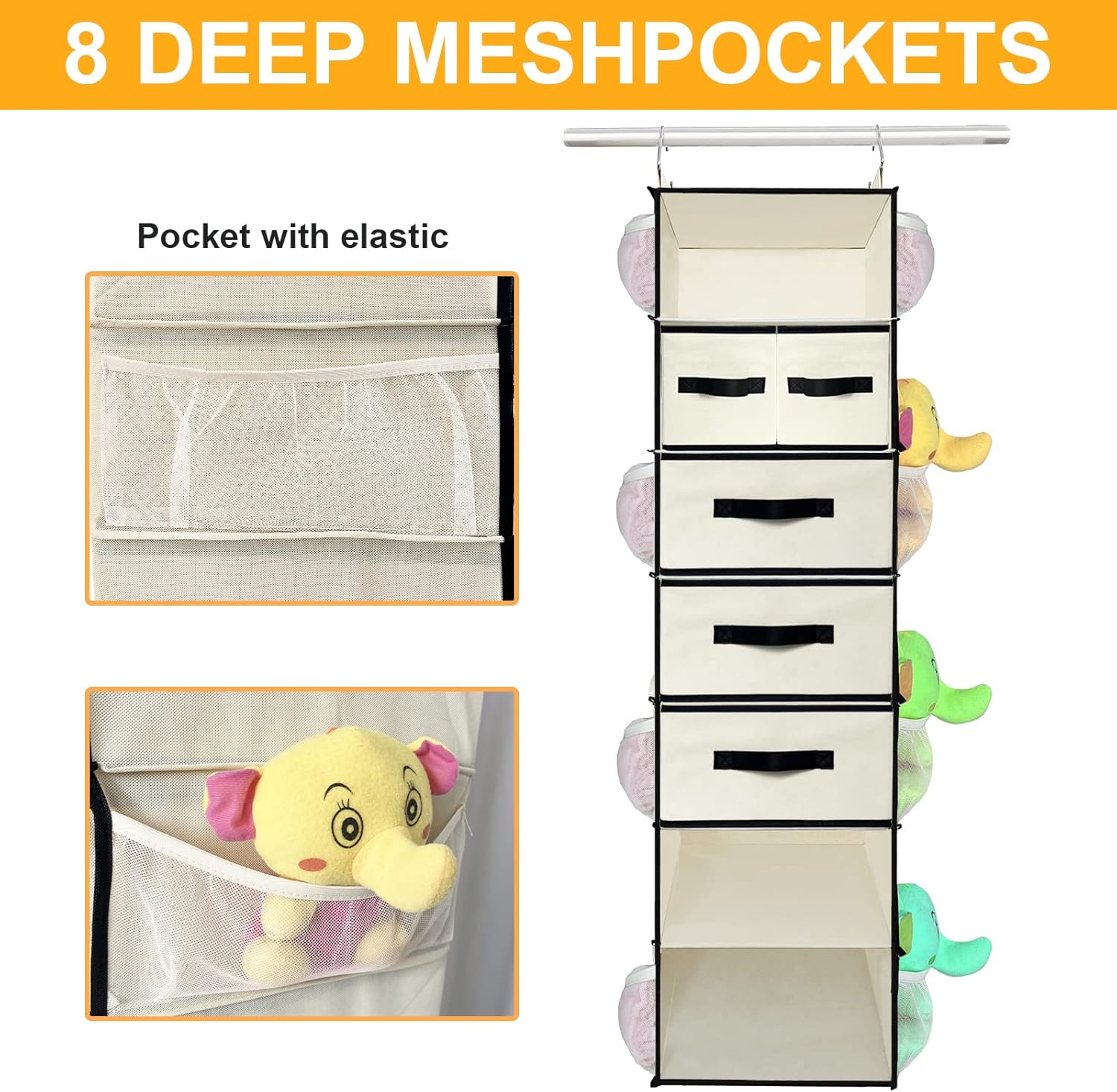 【Large Capacity & Multi-functional】: These hanging closet organizers and storage shelves will come with 7 layers of storage space, 5 different drawers can be freely combined and inserted: 1 sock organizer, 2 underwear organizers, 1 bra organizer, 1 T-shirt organizer, 8 side mesh pockets and 2 sturdy hooks for hanging in closet or wardrobe of your bedroom, baby and kids room, dorm room, nursery room, etc.