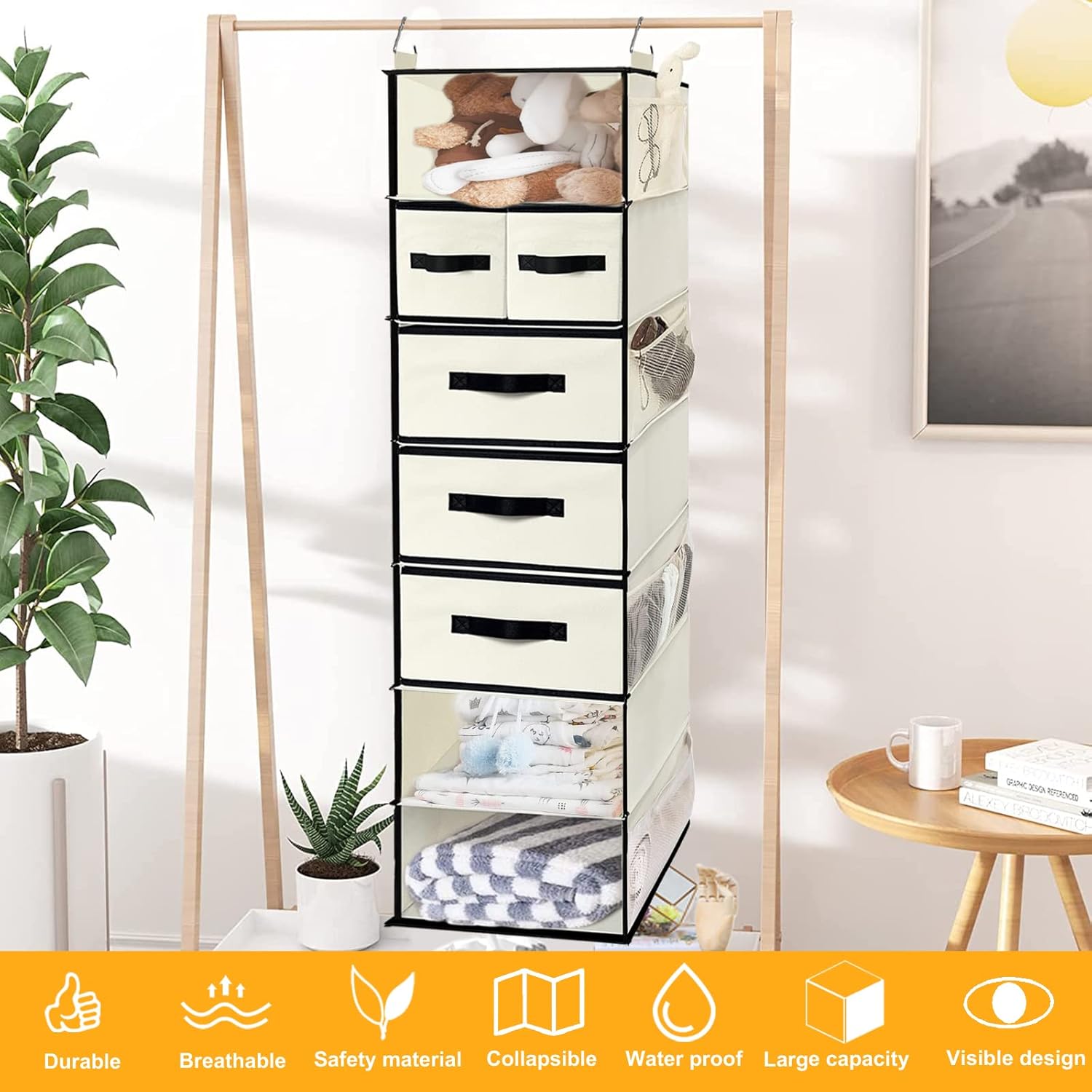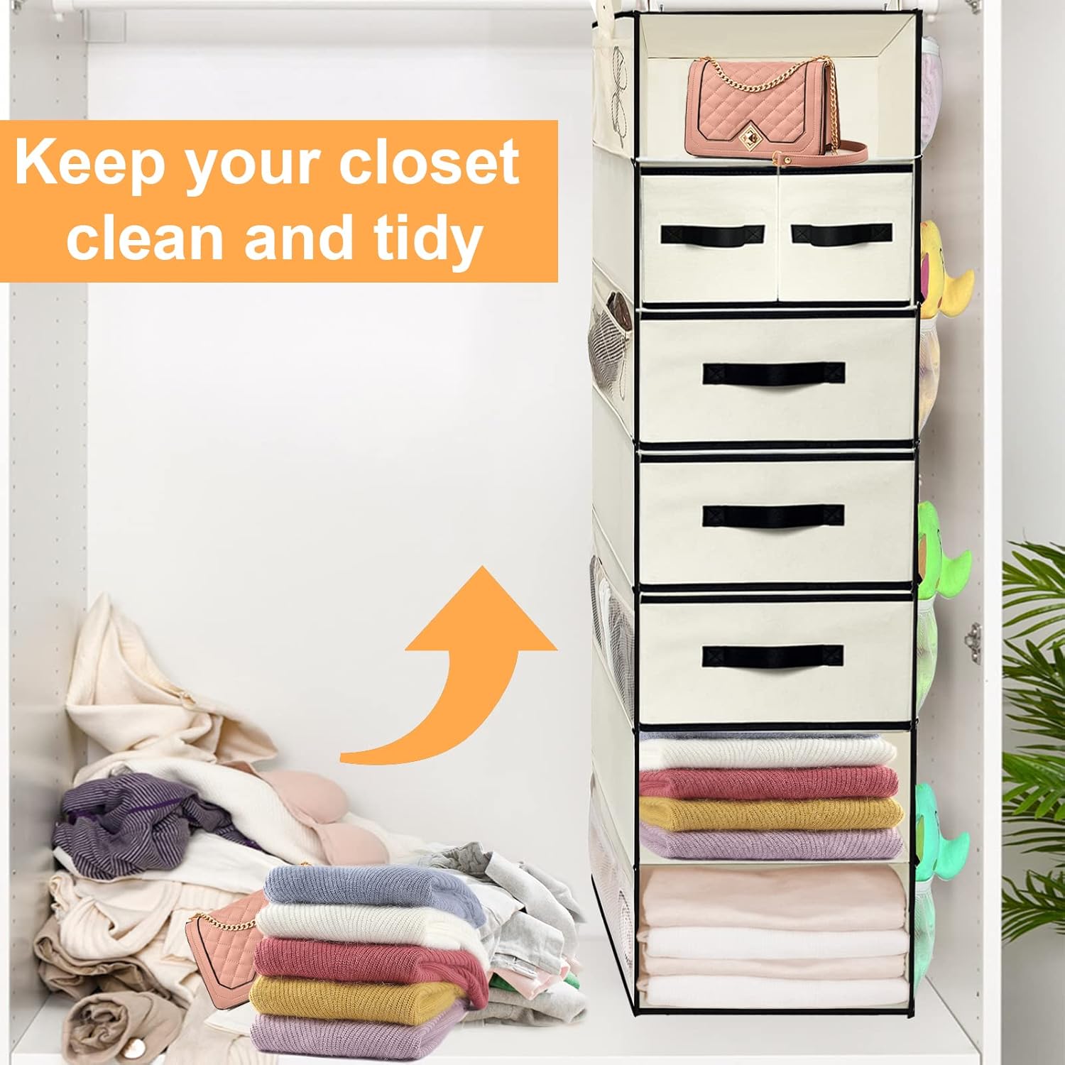 VERONLY Hanging Wardrobe Storage Organizer 7 Shelves, Hanging Shelves for Closet with 5 Removable Drawers, Hanging Clothes Organizer for Bedroom, 12” x 13.6” x 49” (Beige)