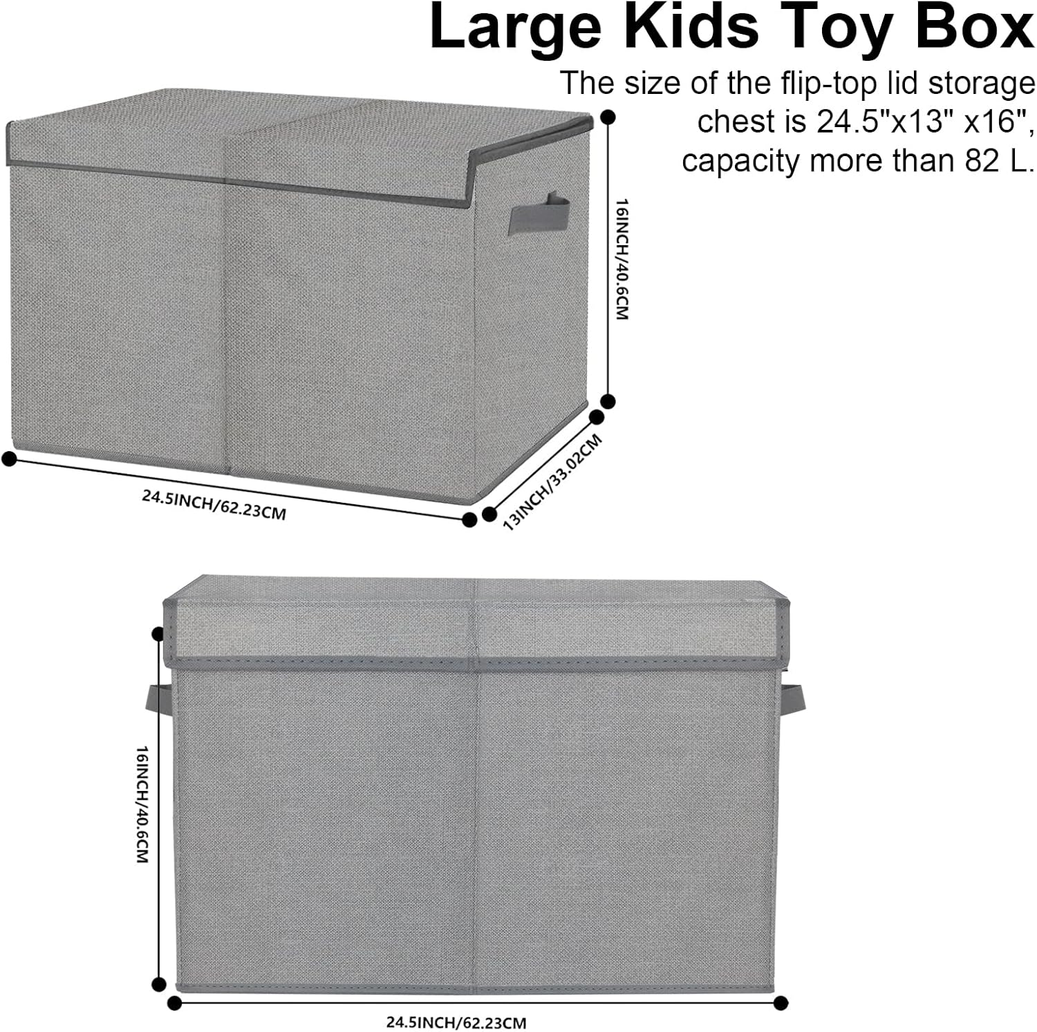 【Large Toy Box】 Foldable toy boxes for kids with Flip-Top Lid closure provides solutions to many storage needs while keeping toys and household items organized, this kids toy box measures 24.5″x13″ x16″.