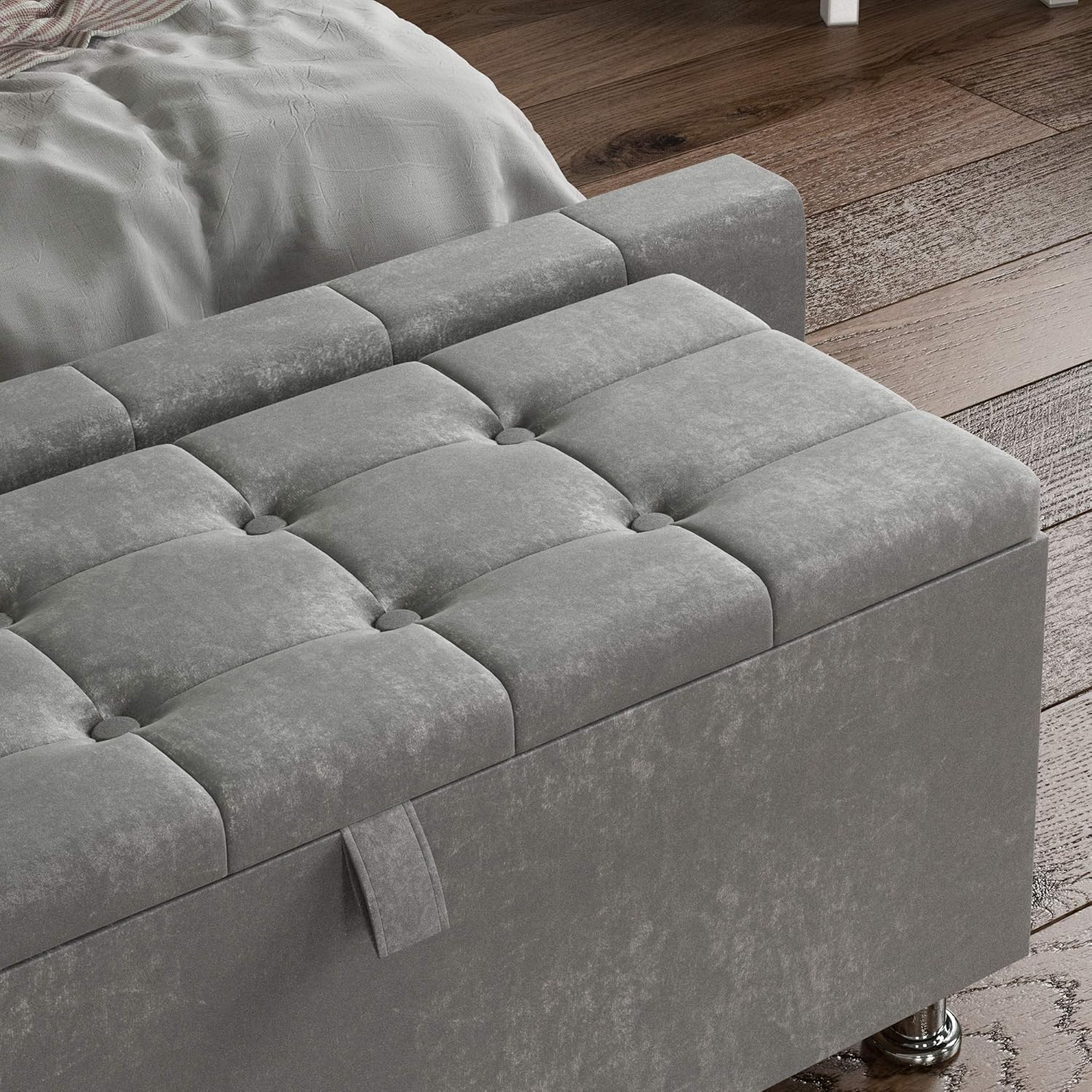 The storage is made of tufted fabric, giving it modern style, it will look great next to your bed or in your hallway. The storage has a fabric handle which makes it easy to pull the lid up and the hinges keep the lid in place once opened, making it easy for you to access and store your items. The ottoman is standing on beautiful silver metal feet which look gorgeous with both linen and velvet material.