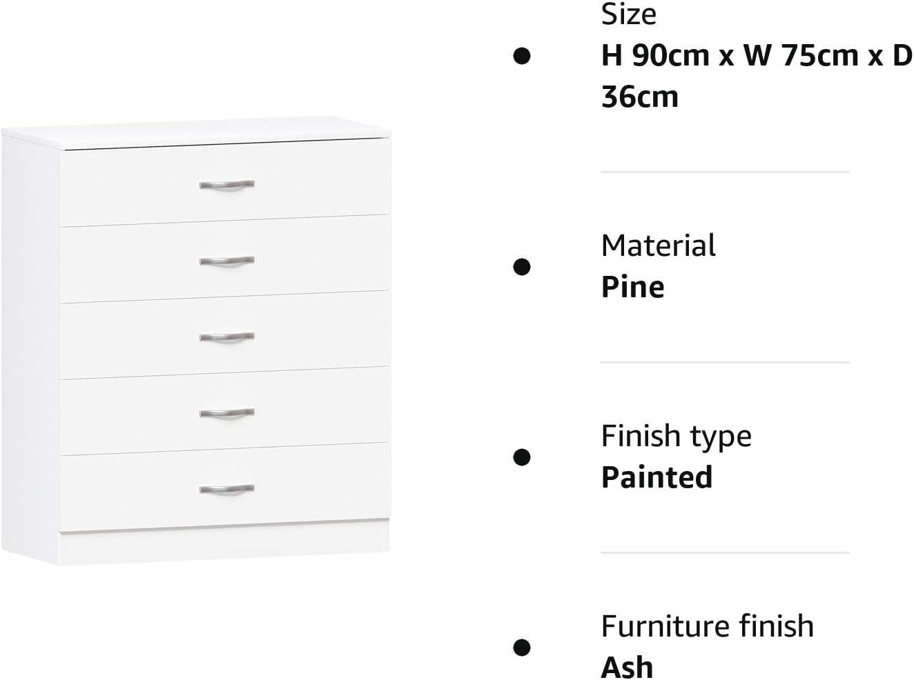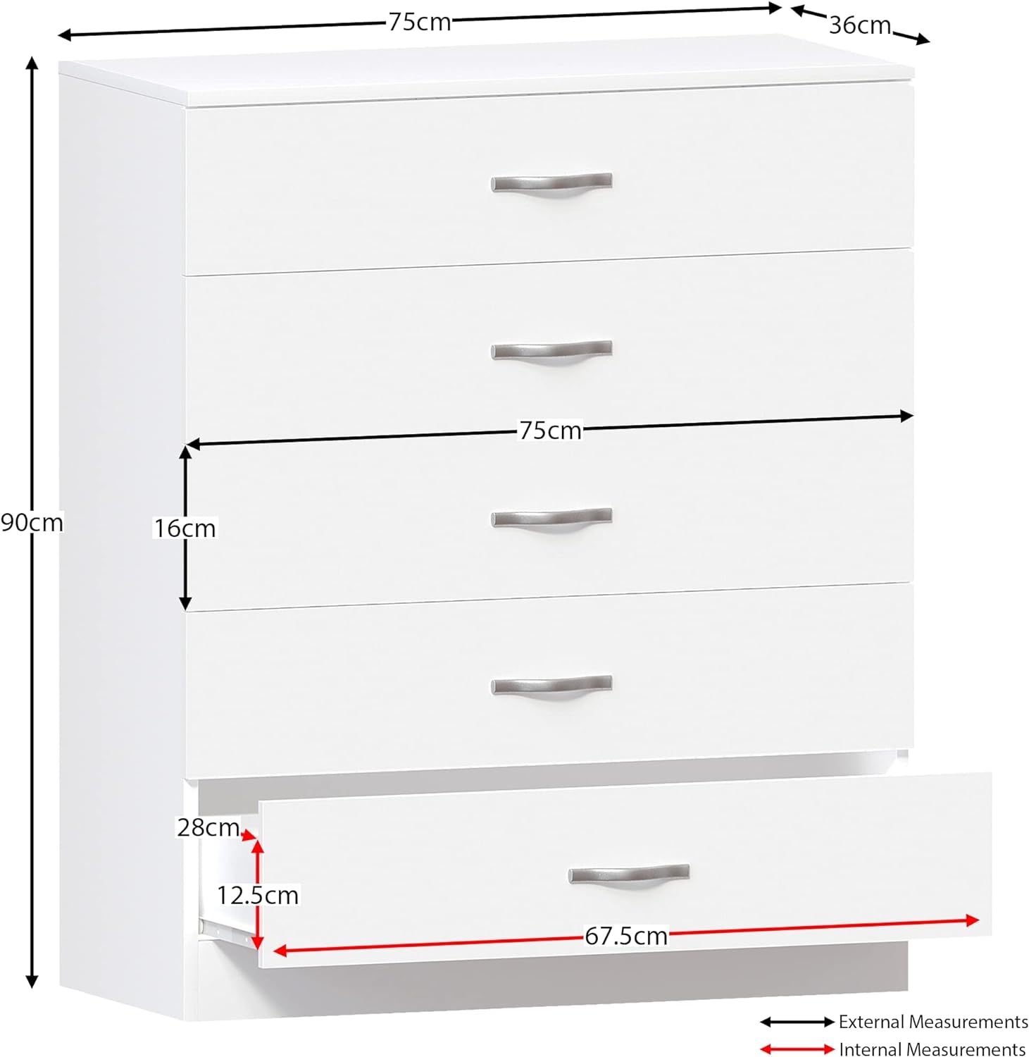Sturdy and durable construction: The 5 drawer chest is crafted from a combination of high-quality MDF and chipboard, which ensures strength and durability. The materials are known for their ability to resist wear and tear making the chest long-lasting and ideal for everyday use.