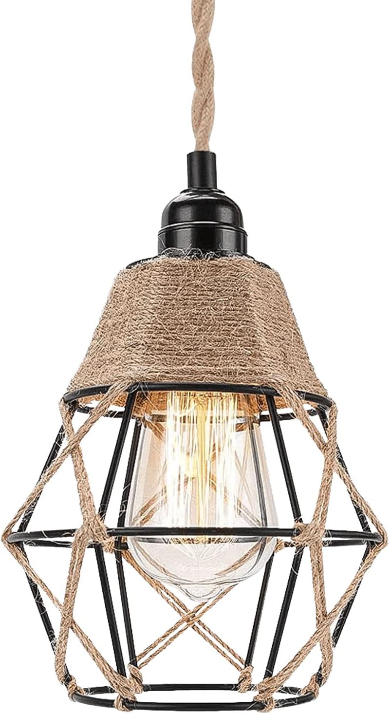 Vintage Hemp Rope Farmhouse Lamp Shades – Mini Wire Cage Hanging Light Fixture – Rustic Industrial Woven Pendant Light Wall Sconces Lampshade – Metal Bulb Guard Cage for Hanging Pendant Replacement