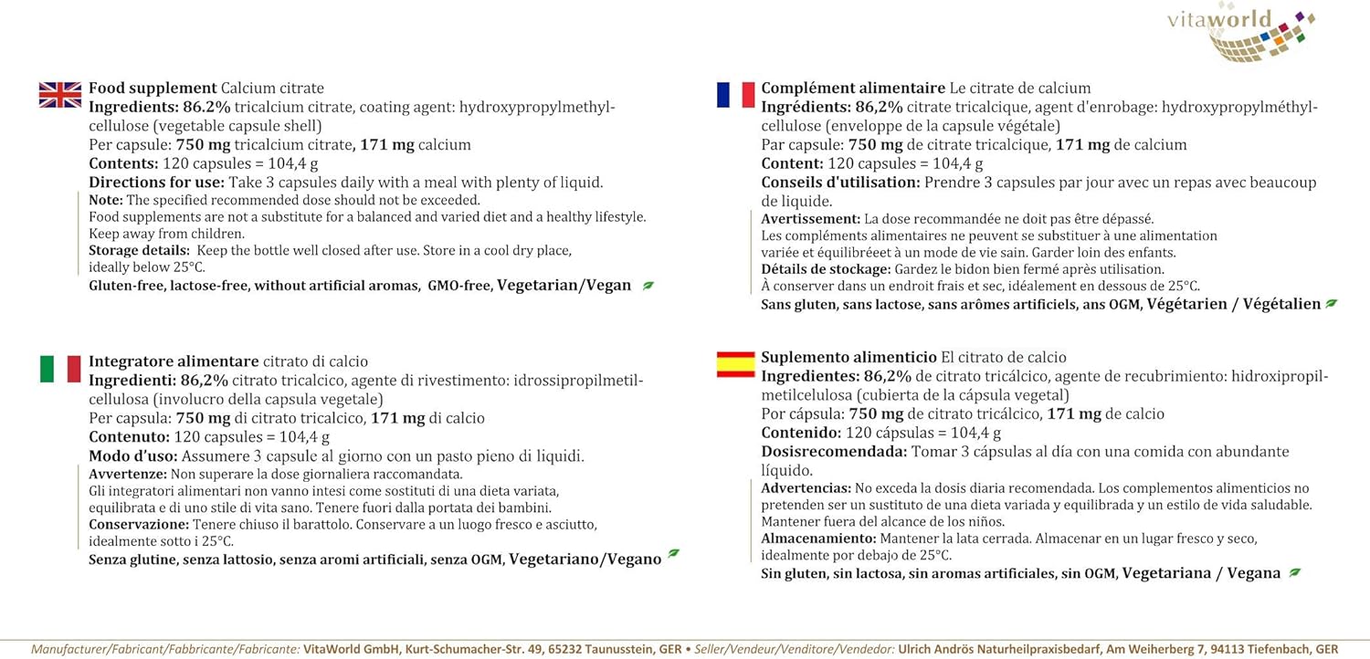 Contents: 120 vegetarian capsules = 114.2g. Ingredients: Calcium citrate, capsule shell hypromellose (vegetarian),Composition (3 capsules): Calcium 500mg. Suggested use: 3 capsules daily with a meal with sufficient liquid. Expiry date: at least 1 year.