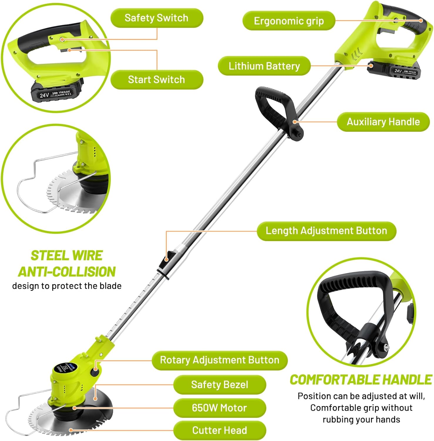【90° Cutting Head & Safety】The grass cutter has 90° cutting head which is easy to deal with different angles of use. Anti-collision iron bars doesn’t fear about damage when it touches hard stones or wall. Garden strimmer cordless has 150° protection cover that can effectively prevent grass splashing. To start the machine, you must first press the anti-mistouch switch and then press the start switch which can ensuring safety for accidentally use .