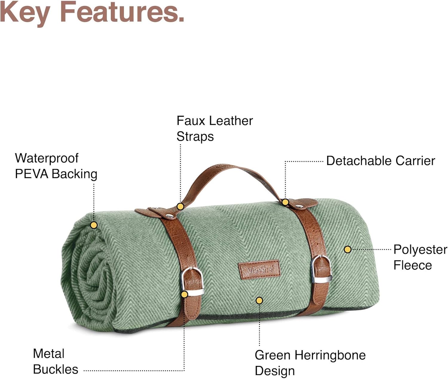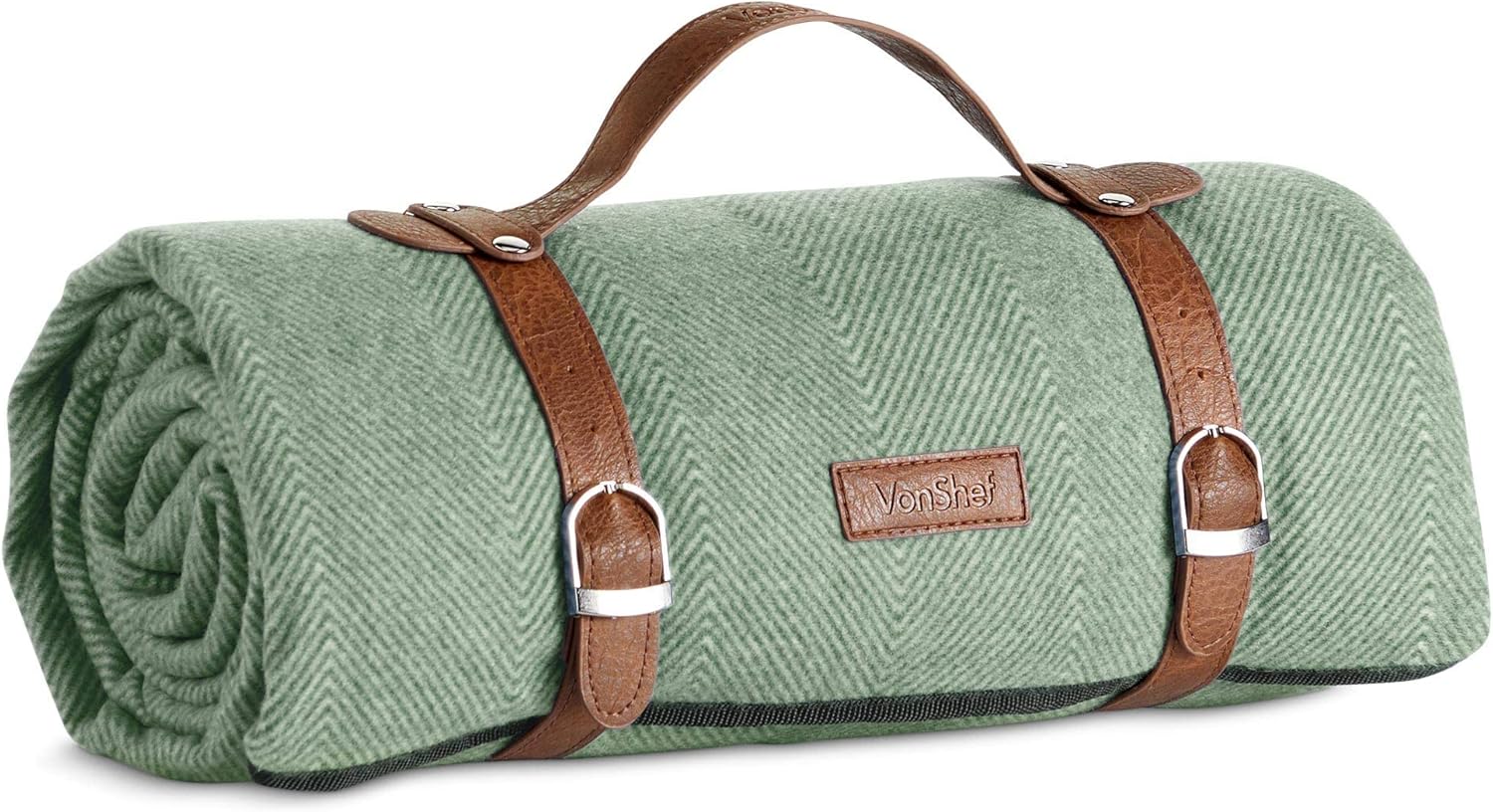 PREMIUM PICNICKING: Take a touch of luxury on your al fresco adventures with the VonShef picnic blanket, finished with a classic herringbone design, faux leather straps, and silver buckles.