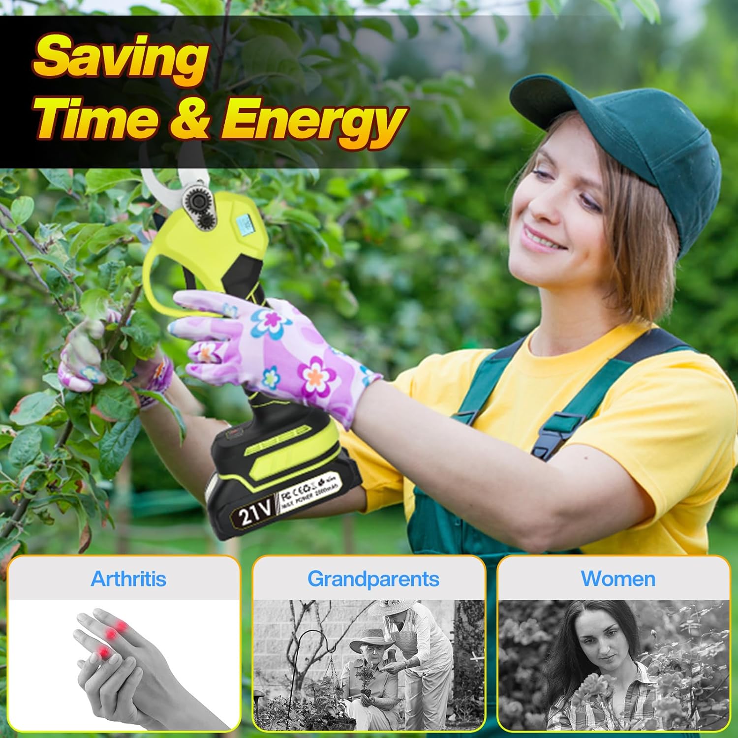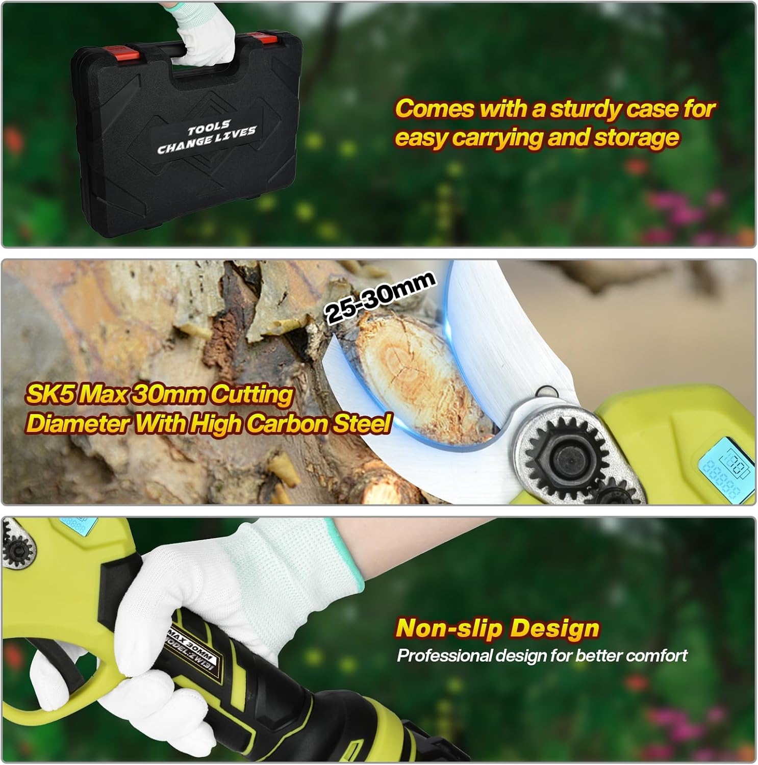 Brushless Motor & 2Pcs 21V 2.0Ah Battery – Powered by a brushless motor which is more efficient, durable, and long-lasting. It offers a 300% longer lifespan and 50% lower energy consumption than other electric shears. The electric pruner has a wide range of uses, can be used in all kinds of gardens, parks, farms, large pastures, orchards, greenhouses, you can cut grapes, cherry trees, apple trees and so on