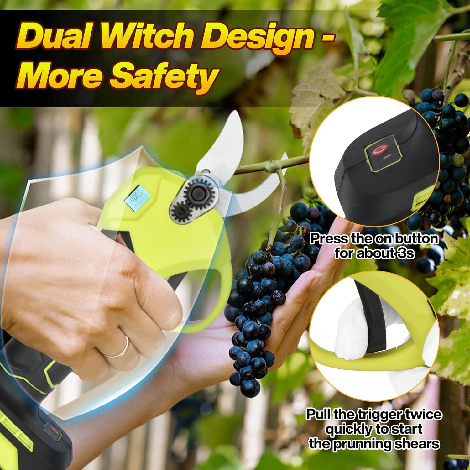The pruning shears have a built-in safety switch to prevent children from accidentally starting the tool. When you turn on the switch, you need to quickly press the trigger twice to start the pruning shears properly.