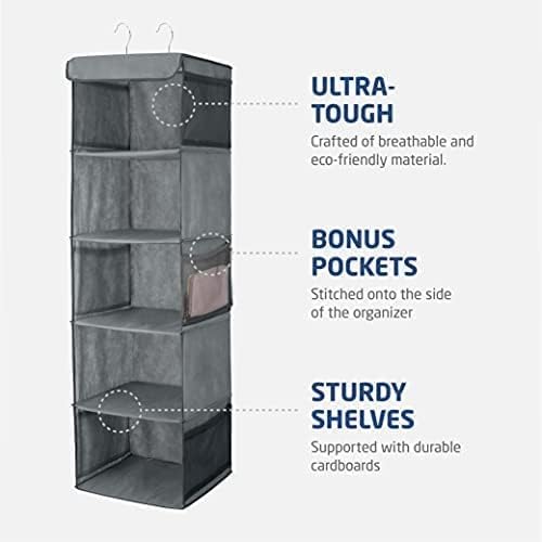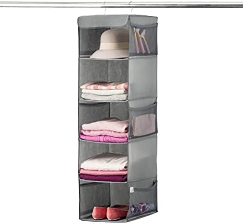 VOW® Wardrobe Hanging Storage Organizer with 5 Shelves & 6 side Pockets sturdy steel hanger | Cupboard Closet Organiser, Storage Shelves for Clothes (12 x 12 x 43 inch) (GREY)