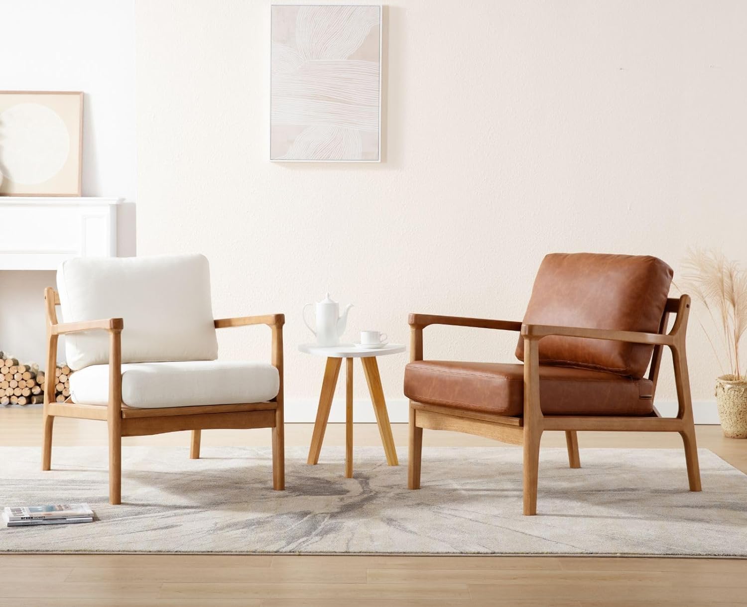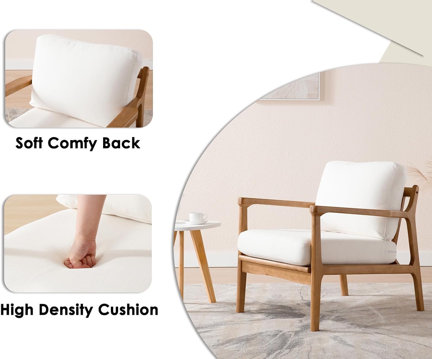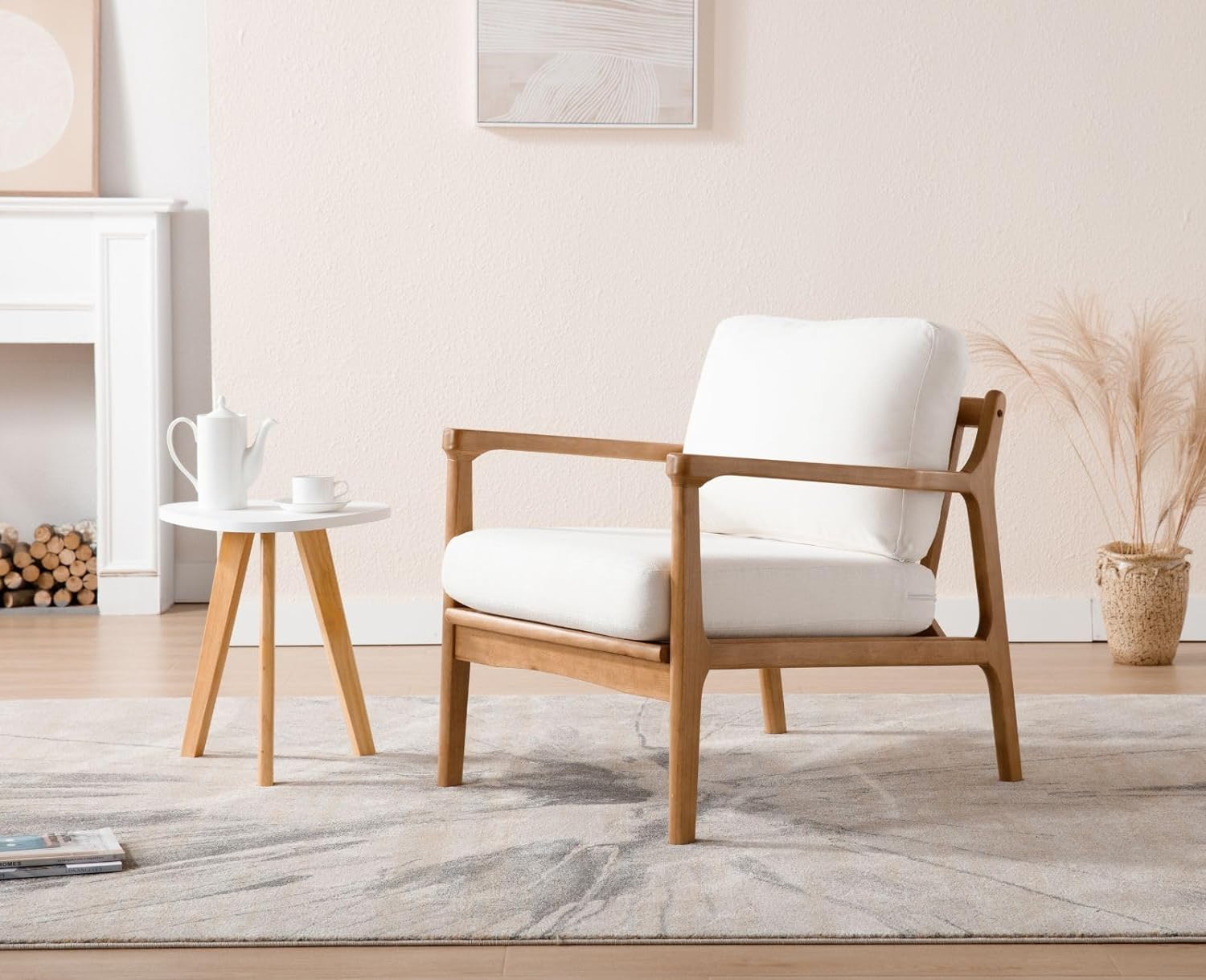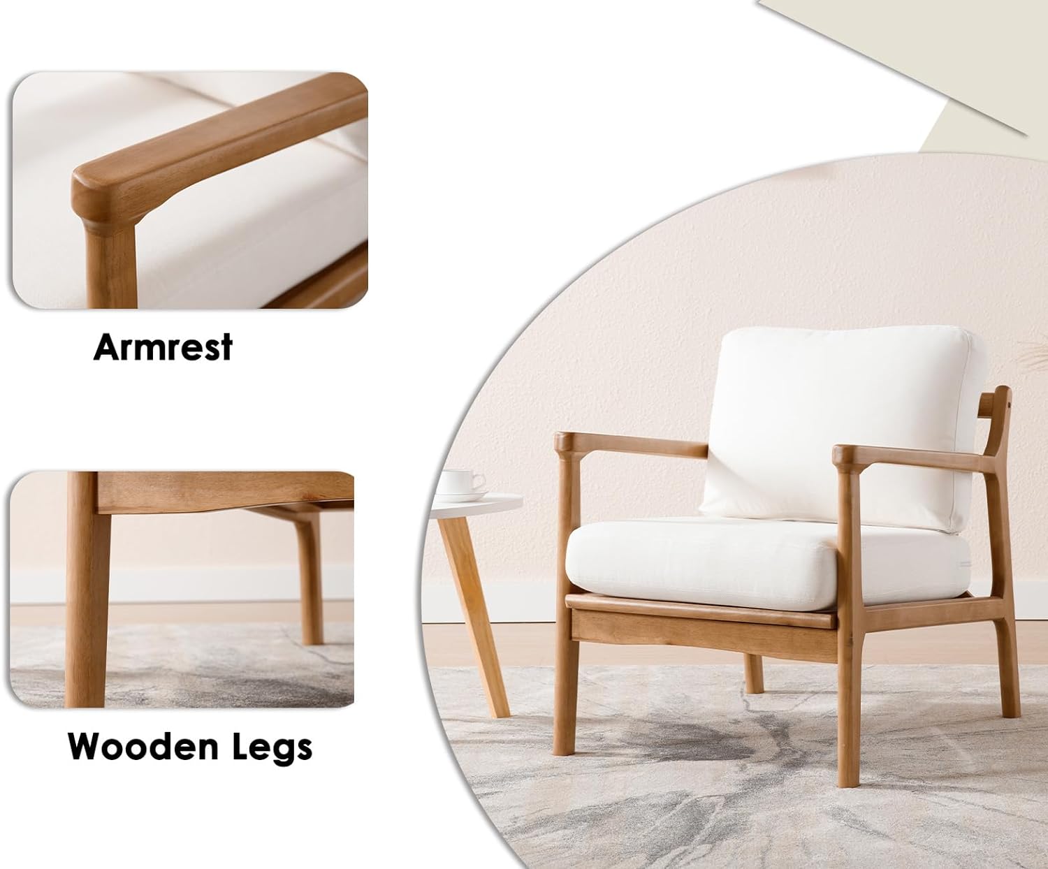 Retro Design- This armchair brings a casual aesthetic to your living room. It has a natural wood frame with a beige upholstery, and it sits on splayed legs for a mid-century modern look.