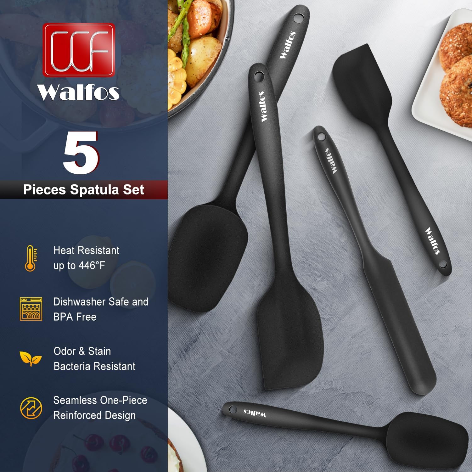 Walfos Silicone Spatula Set – 600ºF Heat Resistant Kitchen Scraper Spatulas, Strong Steel Core and One-Piece Design, Prefect for Cooking Mixing & Baking – BPA Free & Dishwasher Safe Set of 5, Black