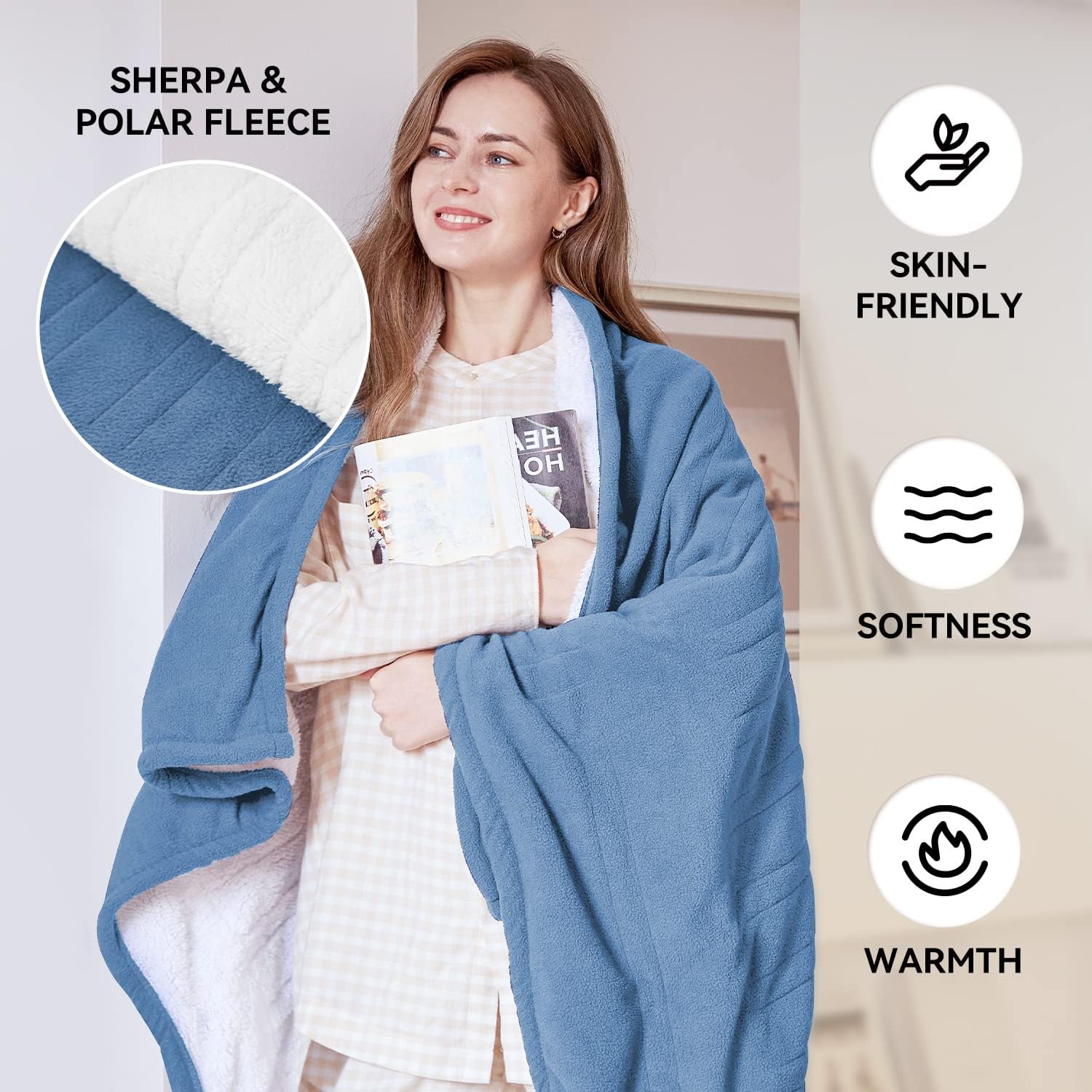 Double-sided Design – Heated throw blanket is made of soft Polar Fleece and Sherpa for efficient insulation and heat transfer.The affordable shaggy electric blanket is not only warm, but the pure white lambswool inner layer is very comfortable to use, allowing you to reap the benefits of a perfect sleeping experience.