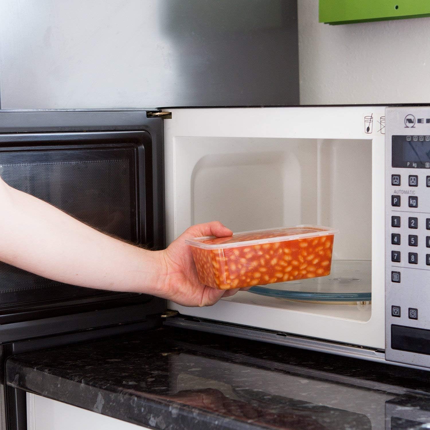 The plastic containers with lids are microwave-safe, dishwasher-safe and freezer-safe, and are ideal for transporting hot/cold food items.