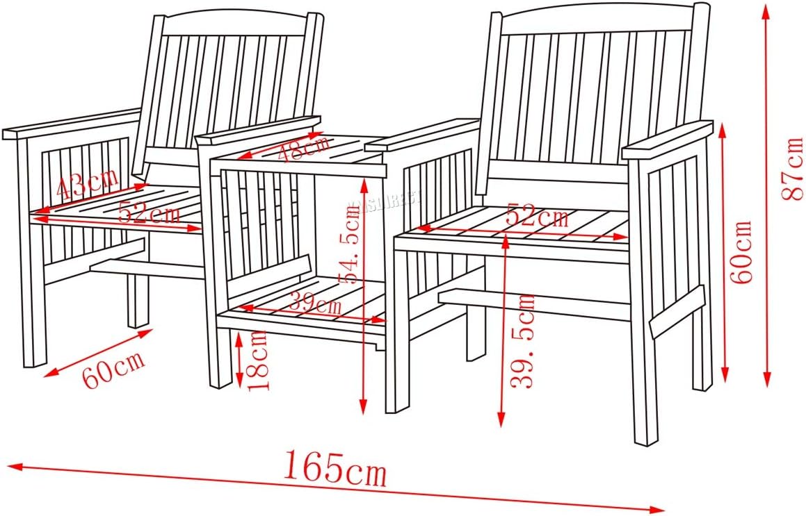 Model No BT-LS02 Colour Natural Material Pine wood Overall dimension 165 (W) x 60 (D) x 87 (H) cm Table dimensions 39 (W) x 48 (D) cm Seat depth 43 cm Armrest height 60 cm Seat height from ground 39.5cm Parasol hold Dia 5cm Chair Weight Capacity 150KG Shelf Weight Capacity 30KG Carton Size 63.5 X 38.5 X 56CM Weight – N.W.: 18KGS; – G.W.: 20KGS;
