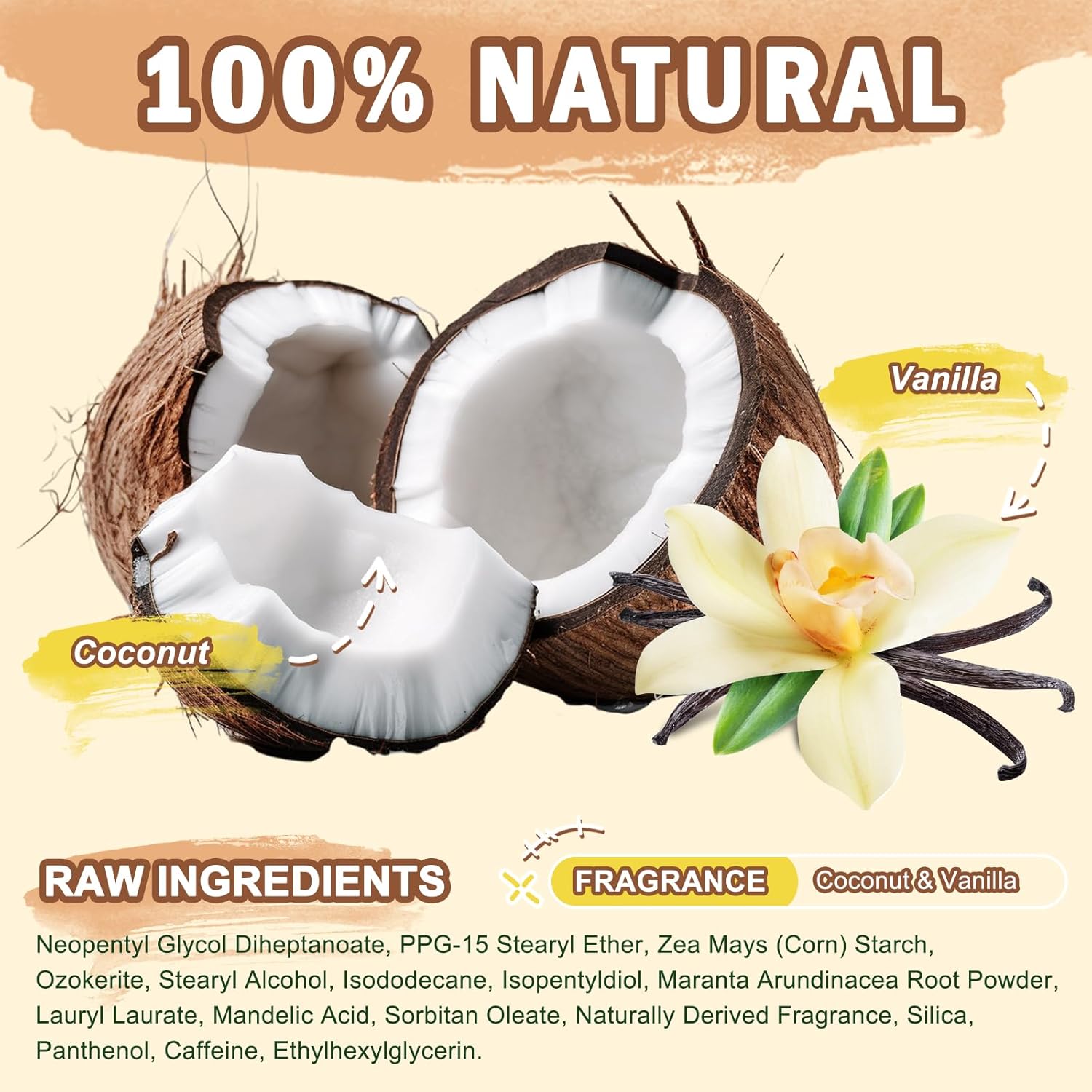 The vanilla formula is added to the tantalizing scent of natural coconut oil, as if you were on a coconut beach, leaving your whole body feeling fresh and relaxed, no longer afraid of any odor, that can be used as a women’s & men’s deodorant.