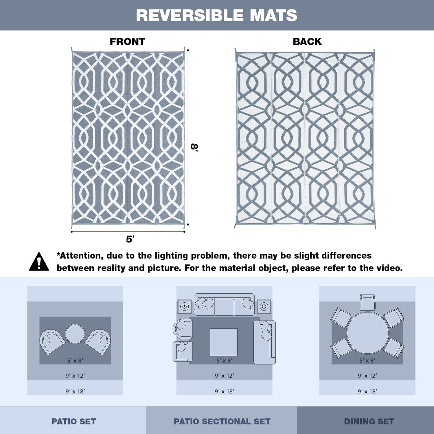 EASY TO CLEAN AND PORTABLE: Simply hose down the plastic rug or sweep the dirt away with a damp cloth and let dry in the sun. The reversible patio mat can be folded into compact sizes for easy storage or carry away for camping, picnic and RV outing.