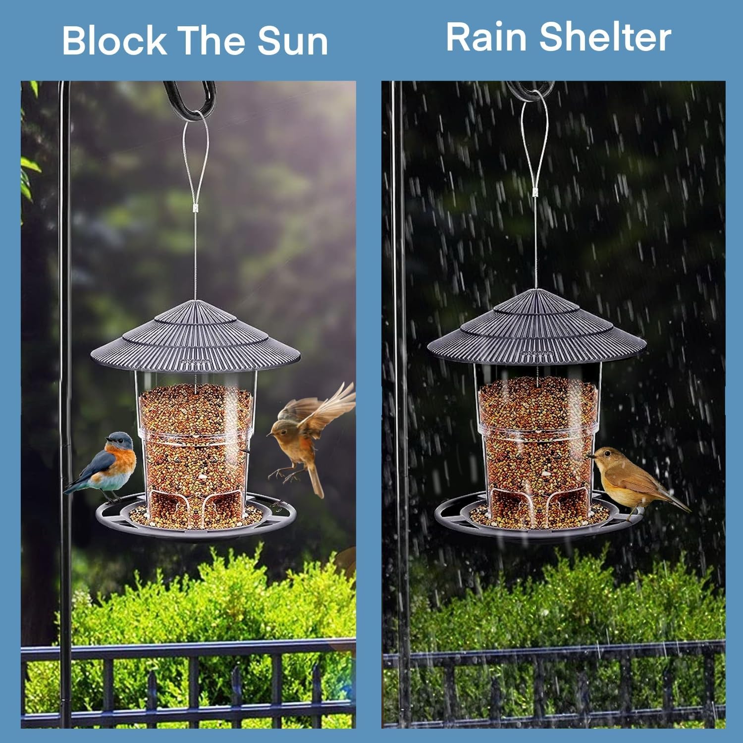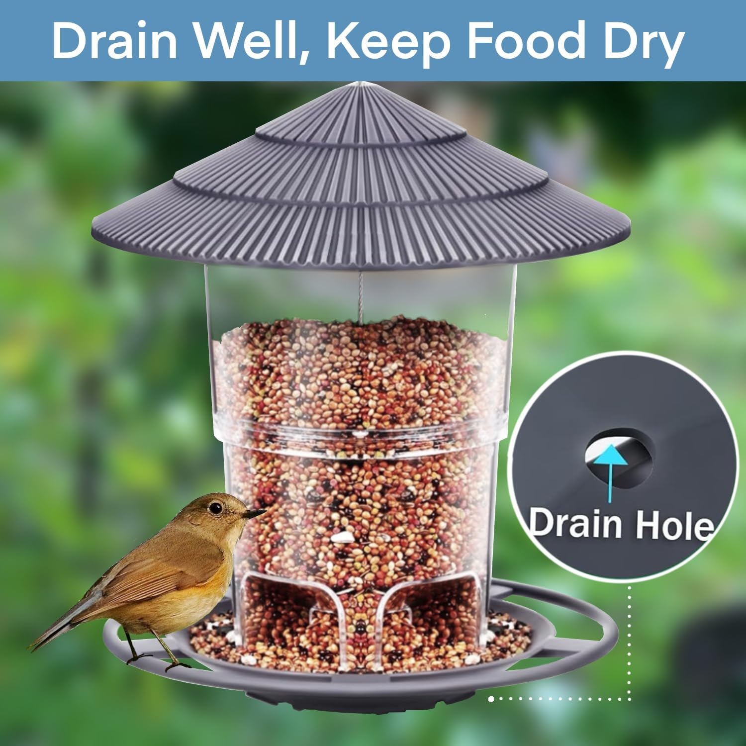 Drain Well, Keep the Food Dry: The hanging bird feeder have some drain holes in the tray to keep the food dry. The top of feeders is wide and can cover the bottom where the seeds are so that it can protect the food well on a rainy days.