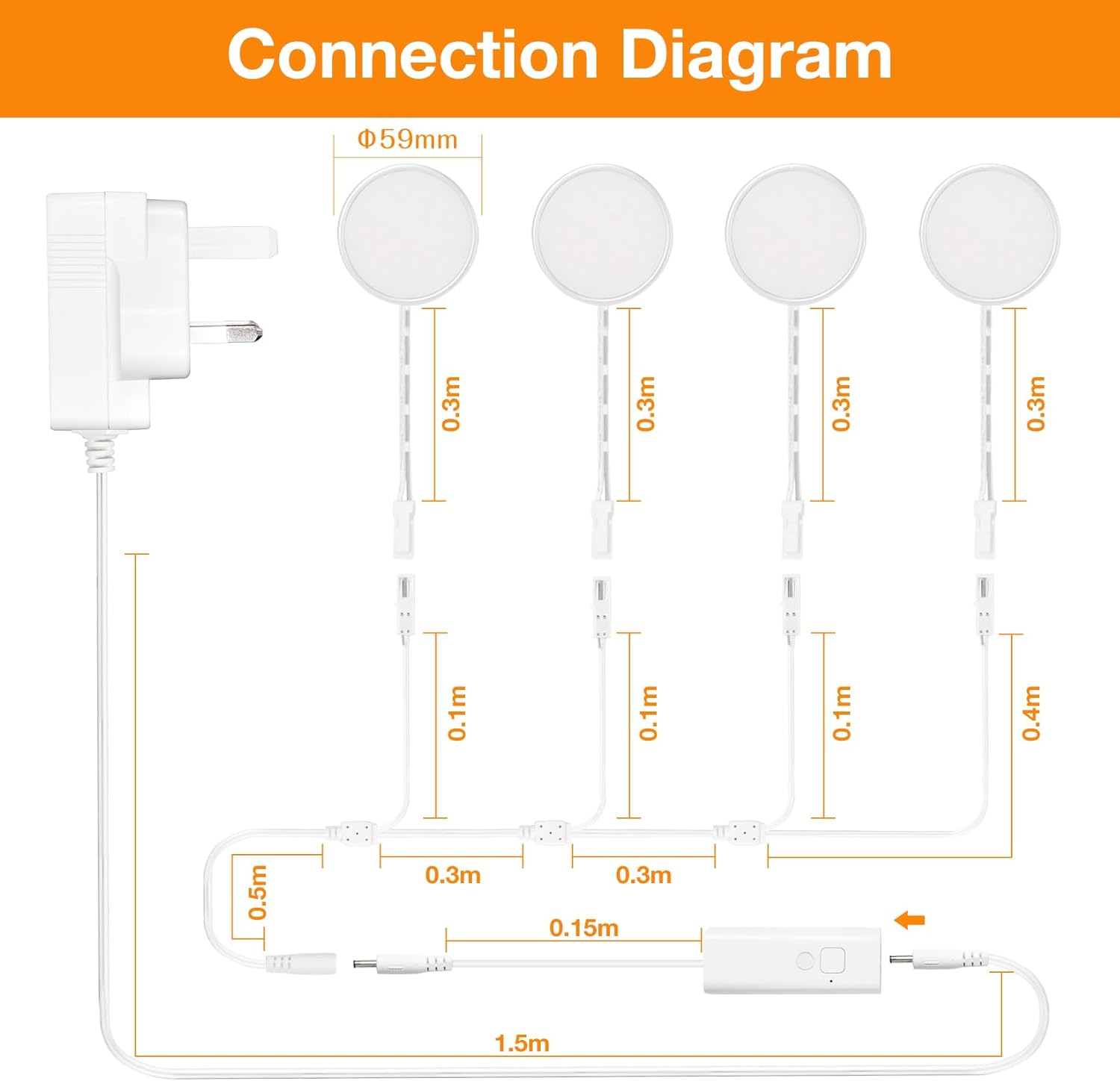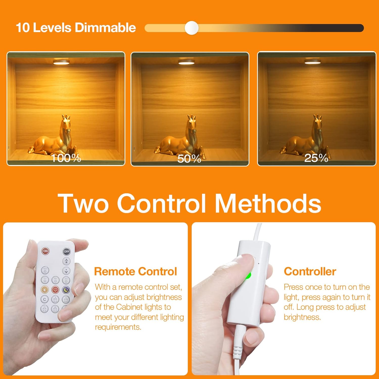 Sufficient brightness & Dimmable: Each puck light has 28 PCS LEDs to provide 175 lumens, total 112 PCS LEDs, 700 lumens,Came with RF dimmer to adjust the brightness.