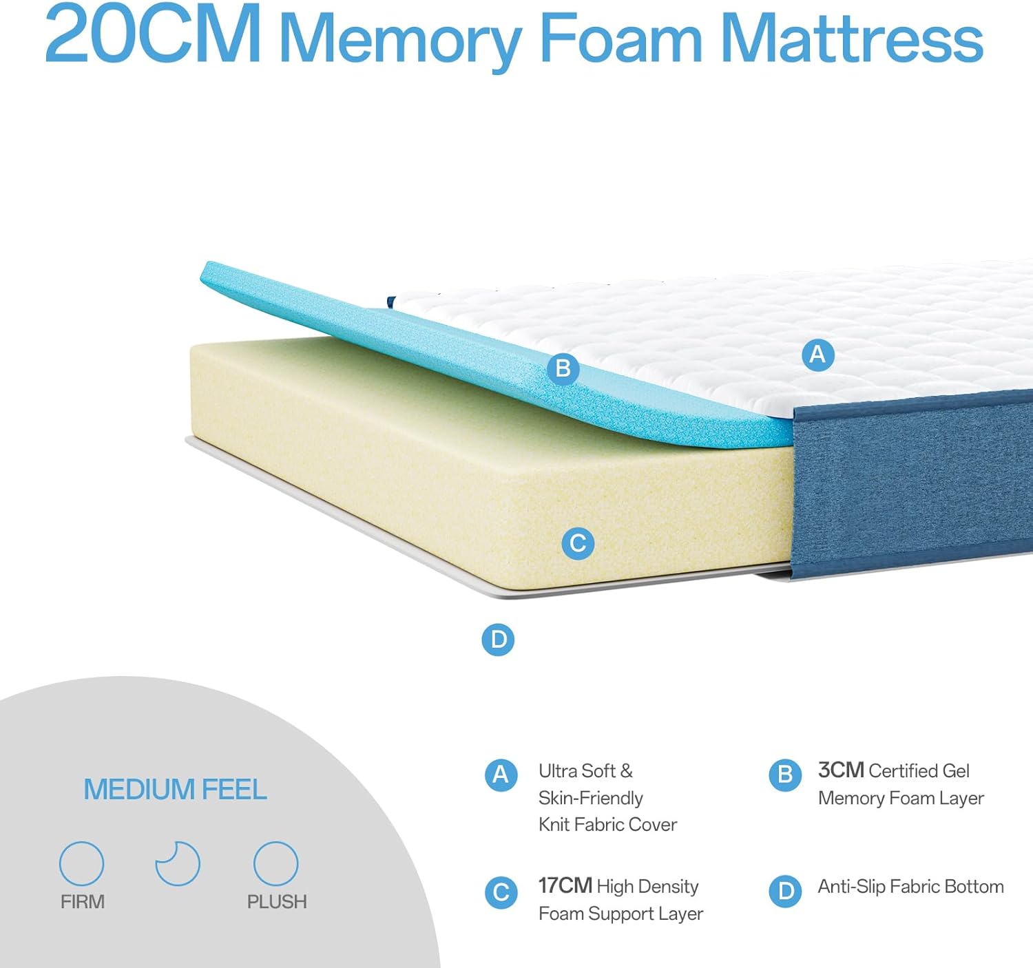 💤 Material and Structure 💤The wowttrelax 20cm Cooling Gel Memory Foam Mattress is designed with a two-layer full foam system to improve support and heat dissipation performance, including 3cm Cooling gel Memory Foam and 17cm Comfort Layer high density base Support Foam layer for the best sleep experience.