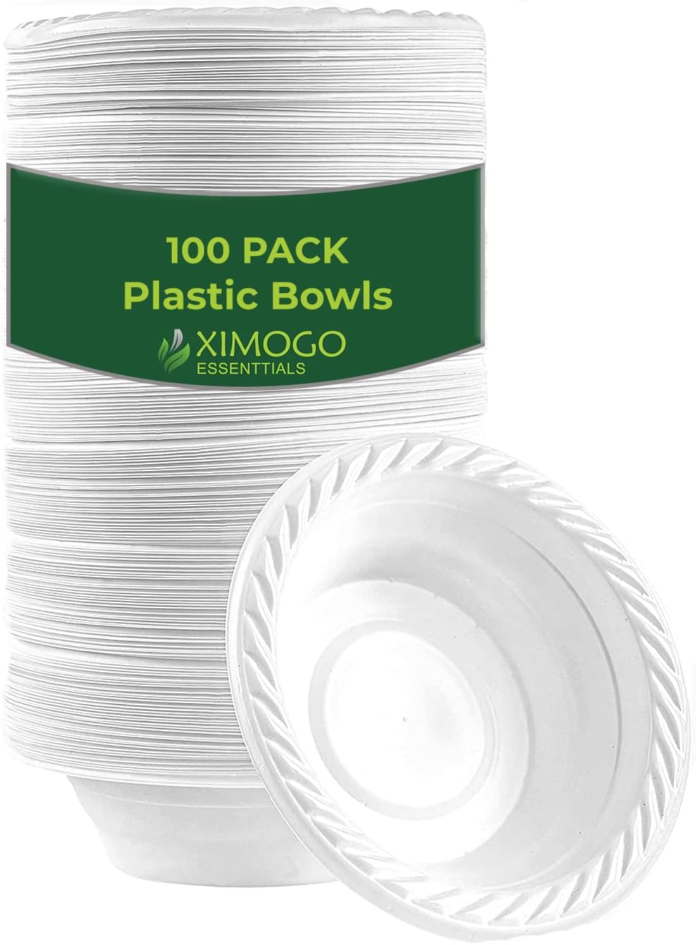 XIMOGO Pack of 100 Plastic Bowls – 12 OZ Tableware and Dinnerware Plastic Bowl – White Plastic Bowls for Parties – Small Plastic Bowls Reusable – Plastic Dessert Bowls – Picnic Bowls