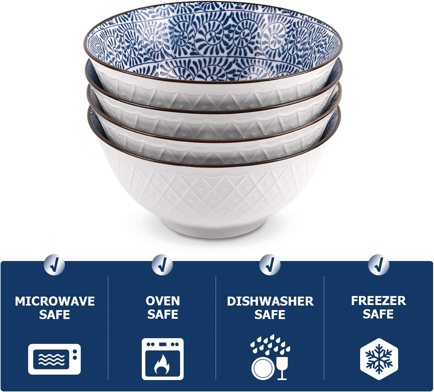 MICROWAVE & DISHWASHER BOWLS — Y YHY blue soup bowls are made of sturdy ceramic, they don’t become hot when microwaving. The ceramic bowls are easy to load into the dishwasher, you could nest about 4 on bowl rack with enough separation to clean.