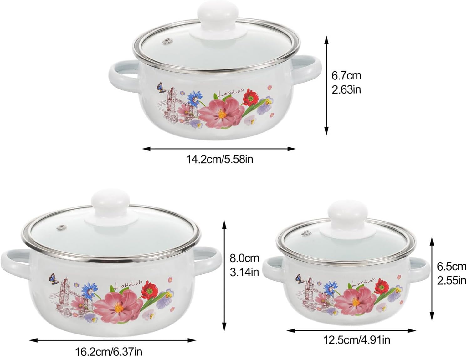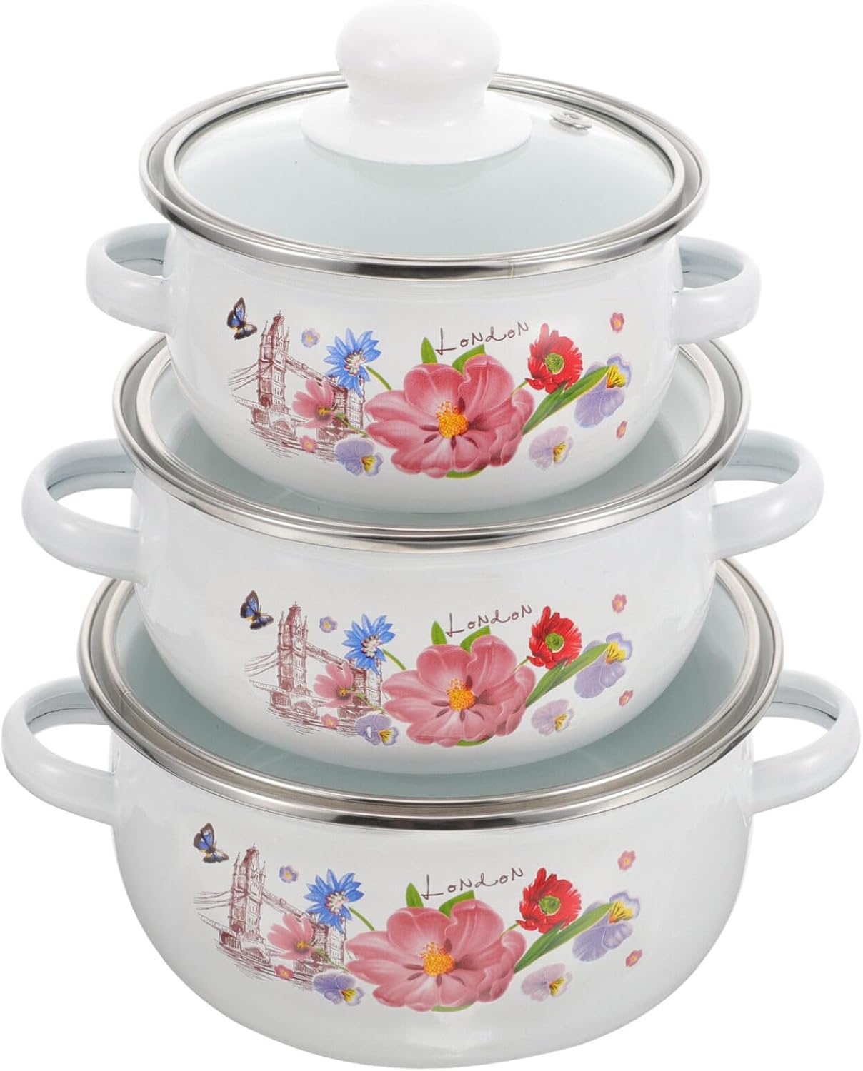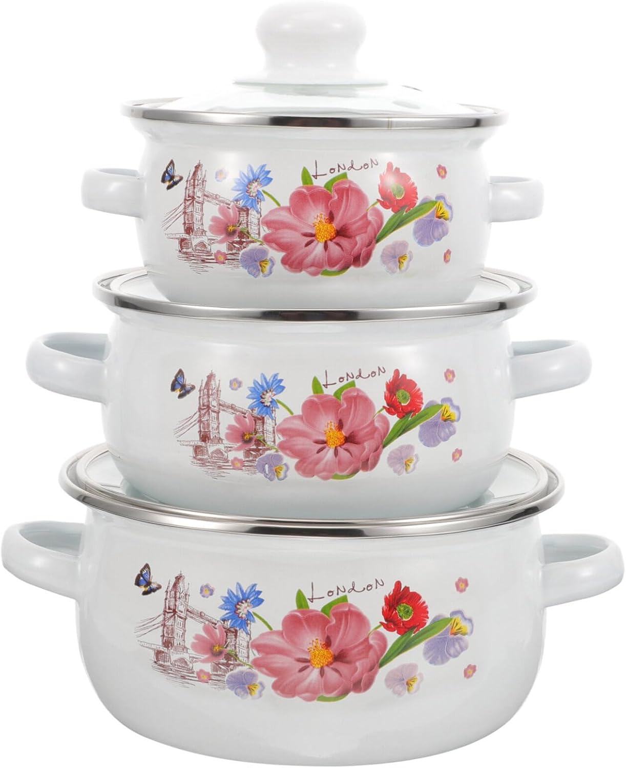 Yardwe 3pcs Enamelware Pot Set, Enamel Stockpot with Lid Floral Retro