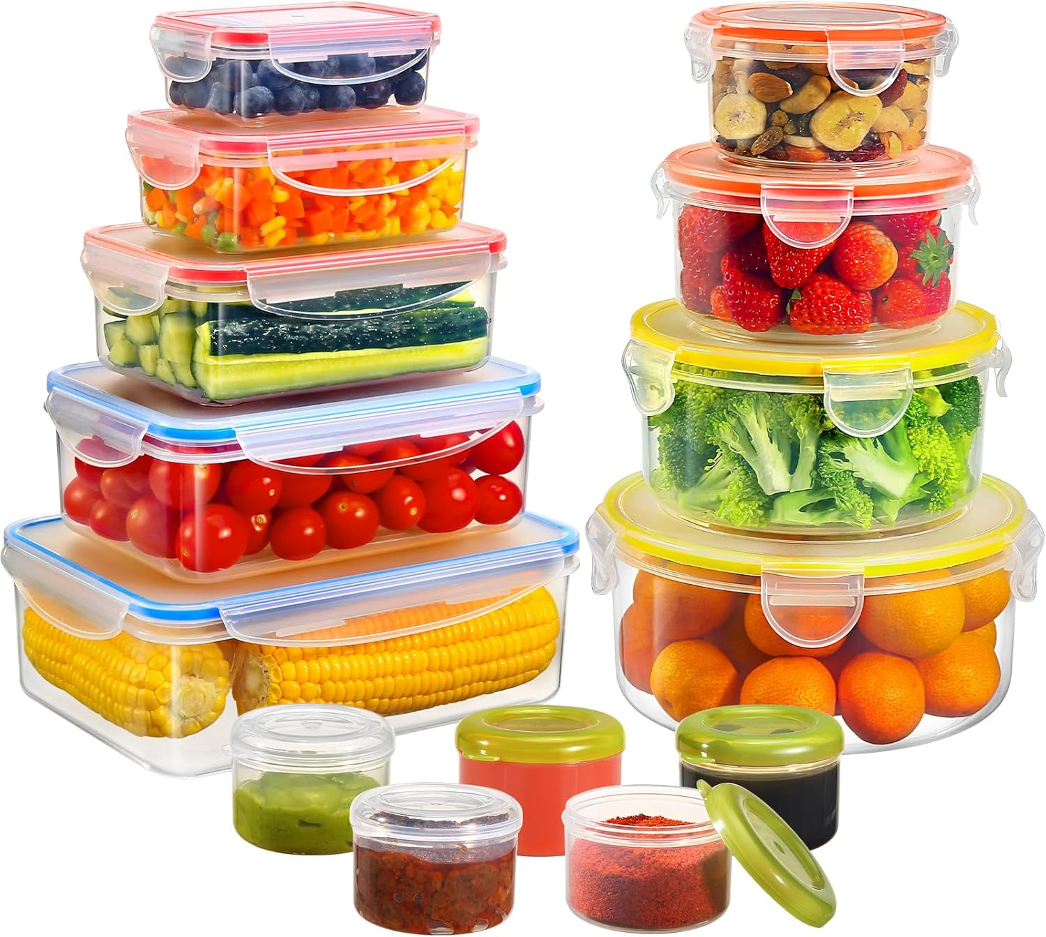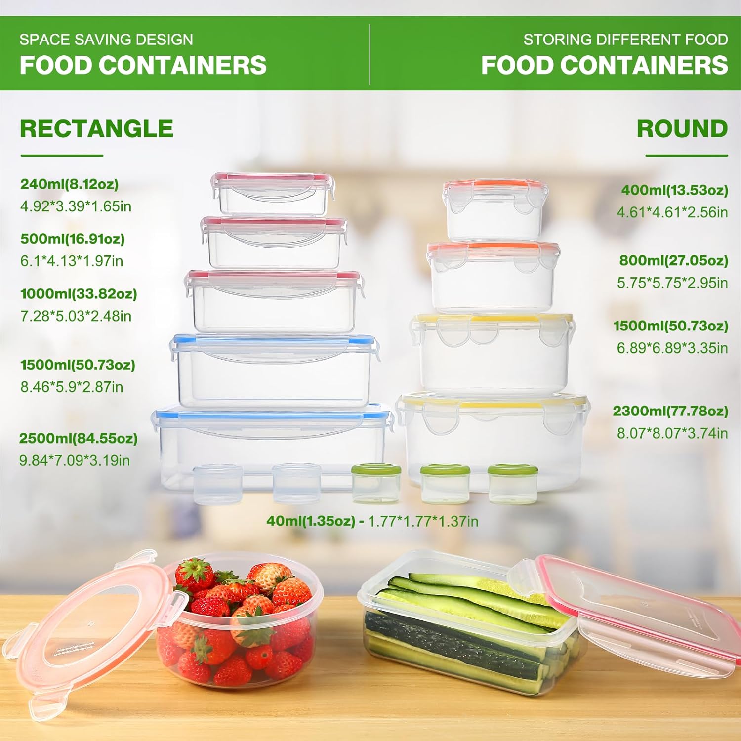 PERFECT SIZE FOR EVERY OCCASION: A wide selection of container sizes suits every requirement makes these food storage containers ideal for preparing work meals, storing leftovers, picnics and more. 28PCS-5 x rectangular containers (1*0.24L, 1*0.5L, 1*1.0L, 1*1.5L, 1*2.5L), 4 x round containers (1*0.4L, 1*0.8L, 1*1.5L, 1*2.3L), 5 x round sauce containers(5*40ml)