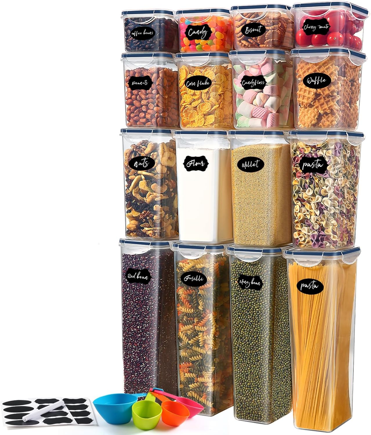 YASHE Airtight Food Storage Containers Set of 16, Plastic Cereal Storage Containers with Lids, BPA Free Kitchen and Pantry Organization for Dry Food, Pasta, Flour & Sugar, with Labels & Marker