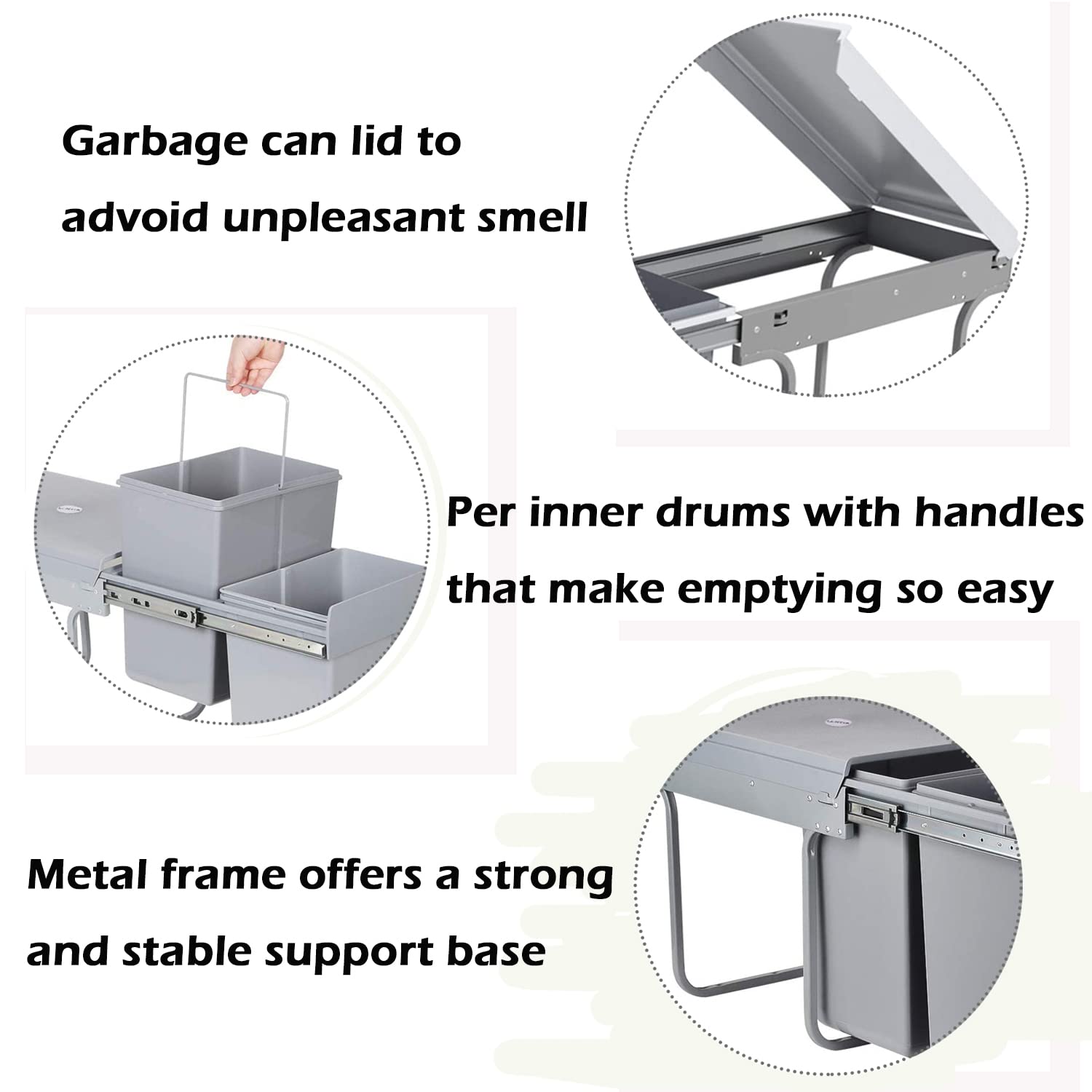 👍【Easy To Use】: Simply open the cabinet door, pull out the bin by the handle and throw the garbage into the bin. The whole process is simple and easy to operate, no need to open the trash can lid, save time and effort, convenient for your life.The track is set tightly, so pushing and pulling requires force, which will improve with time