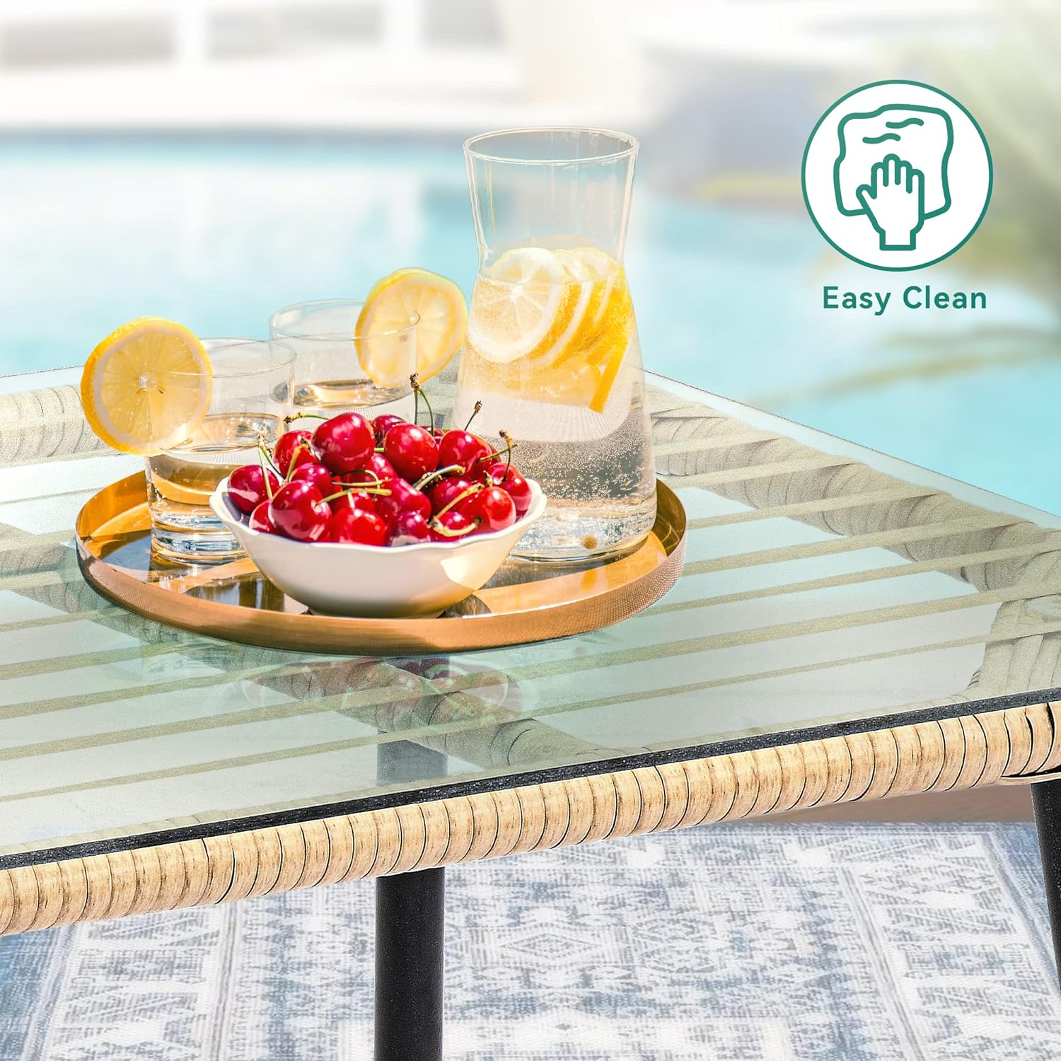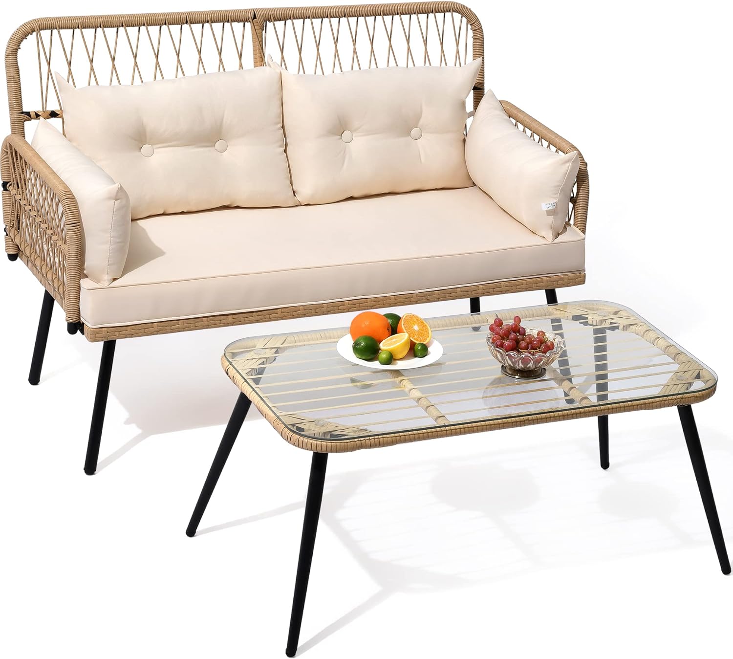 GLASS SIDE TABLE: The patio loveseat features an elegant side table that features a transparent tempered glass top that gleams and provides sturdy support for foods, drinks, or other items within 75lbs.