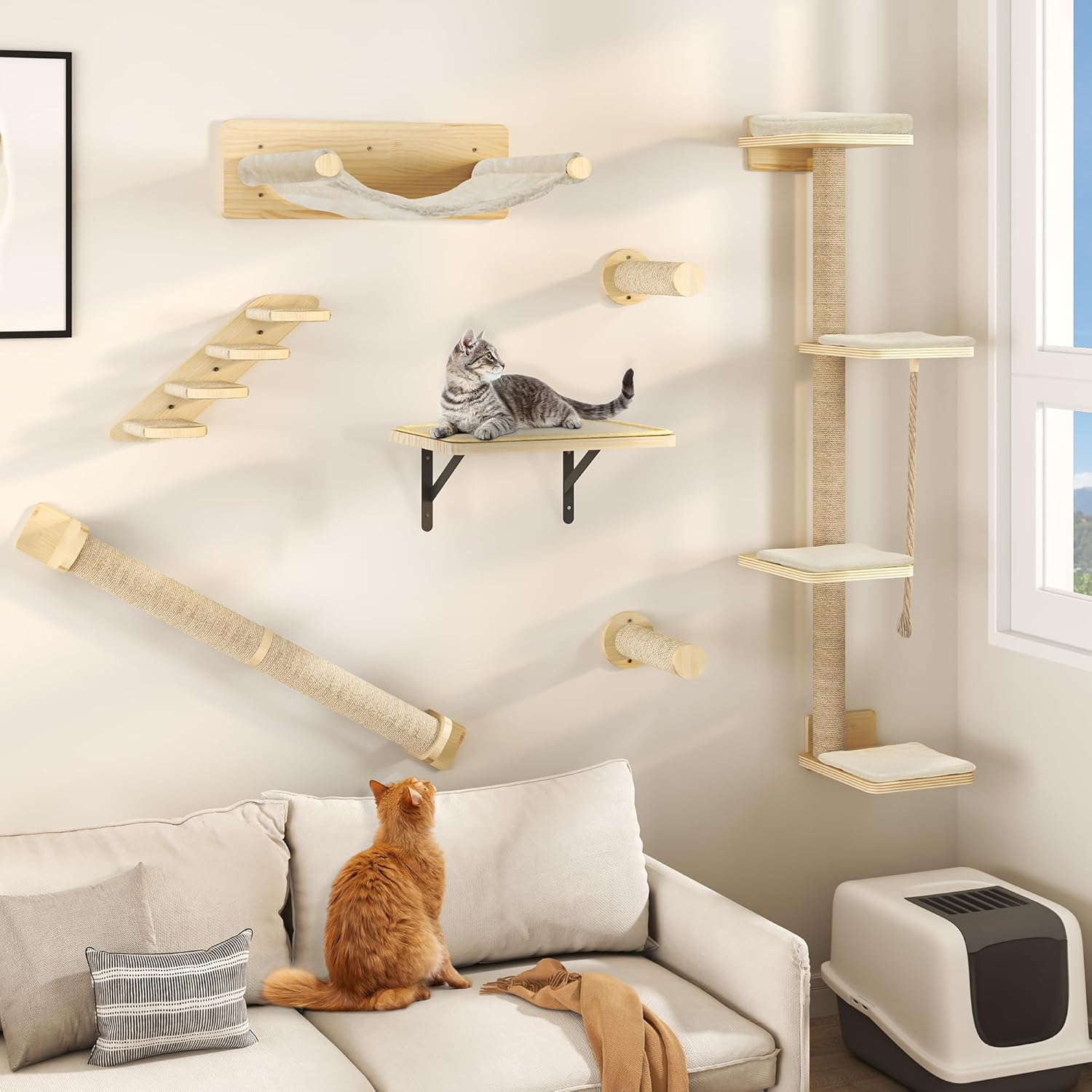 YITAHOME 7PCS Wall Mounted Cat Climbing Shelves, Wooden Cat Wall Furniture, Cat Climbing Tree with 3 Scratching Posts/4 Steps Cat Stairway/Hammock/Cat Bed, Cat Tree Wall Mounted with 4 Platforms