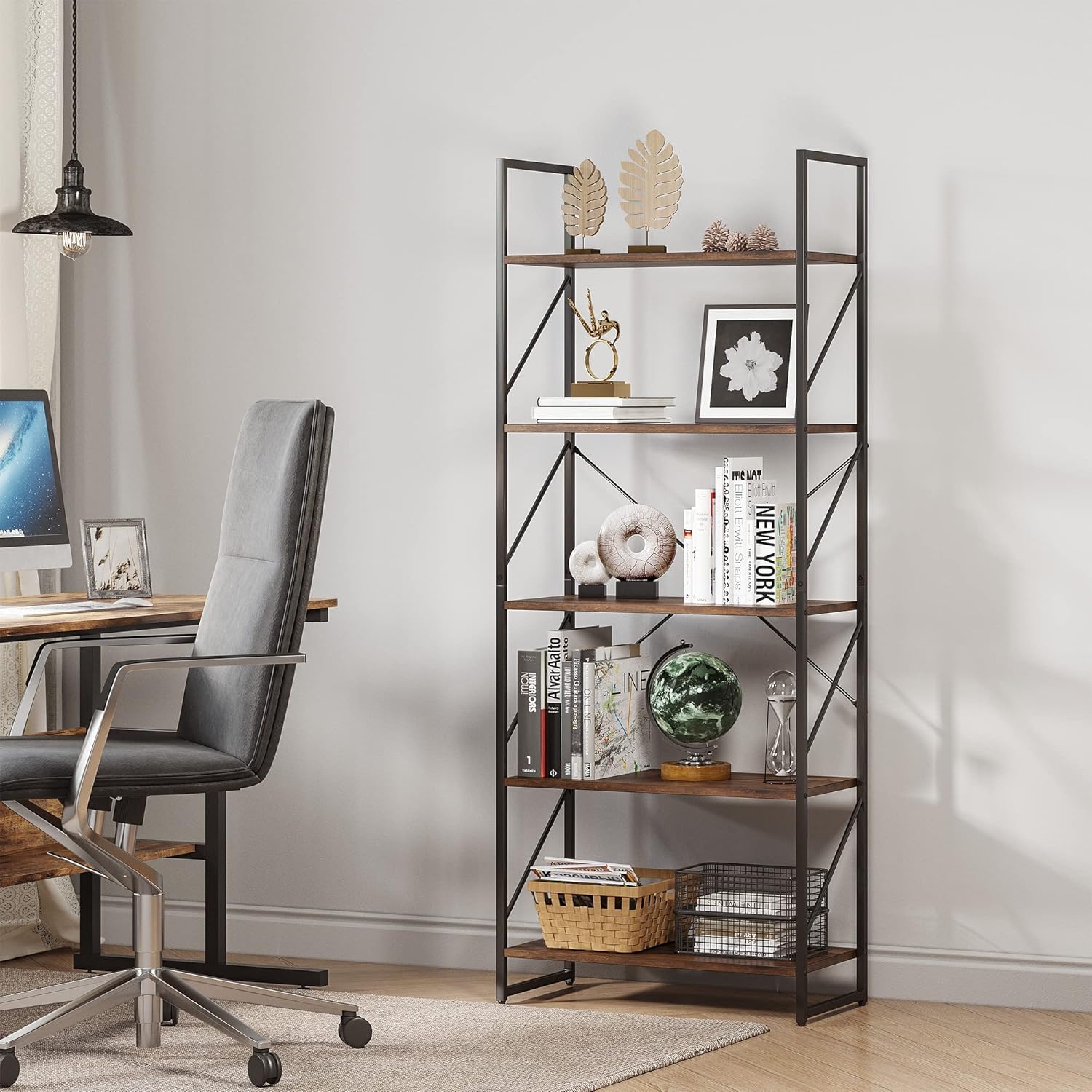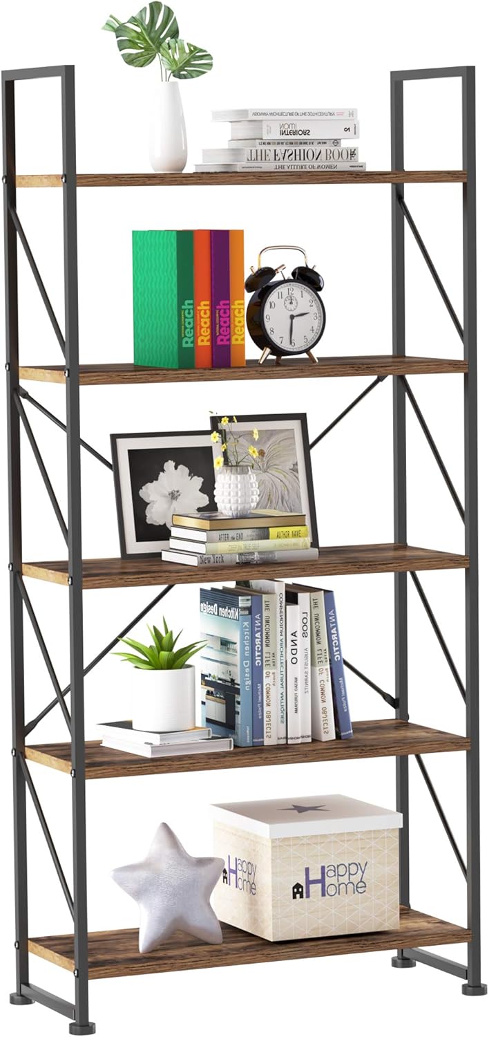 YITAHOME Bookcase 5 Tiers, Floor Standing Book Shelf, Wooden Shelf and Metal Frame Book Rack, Display Storage Rack Shelving Units for Living Room, Home Office – Rustic Brown Bookshelf