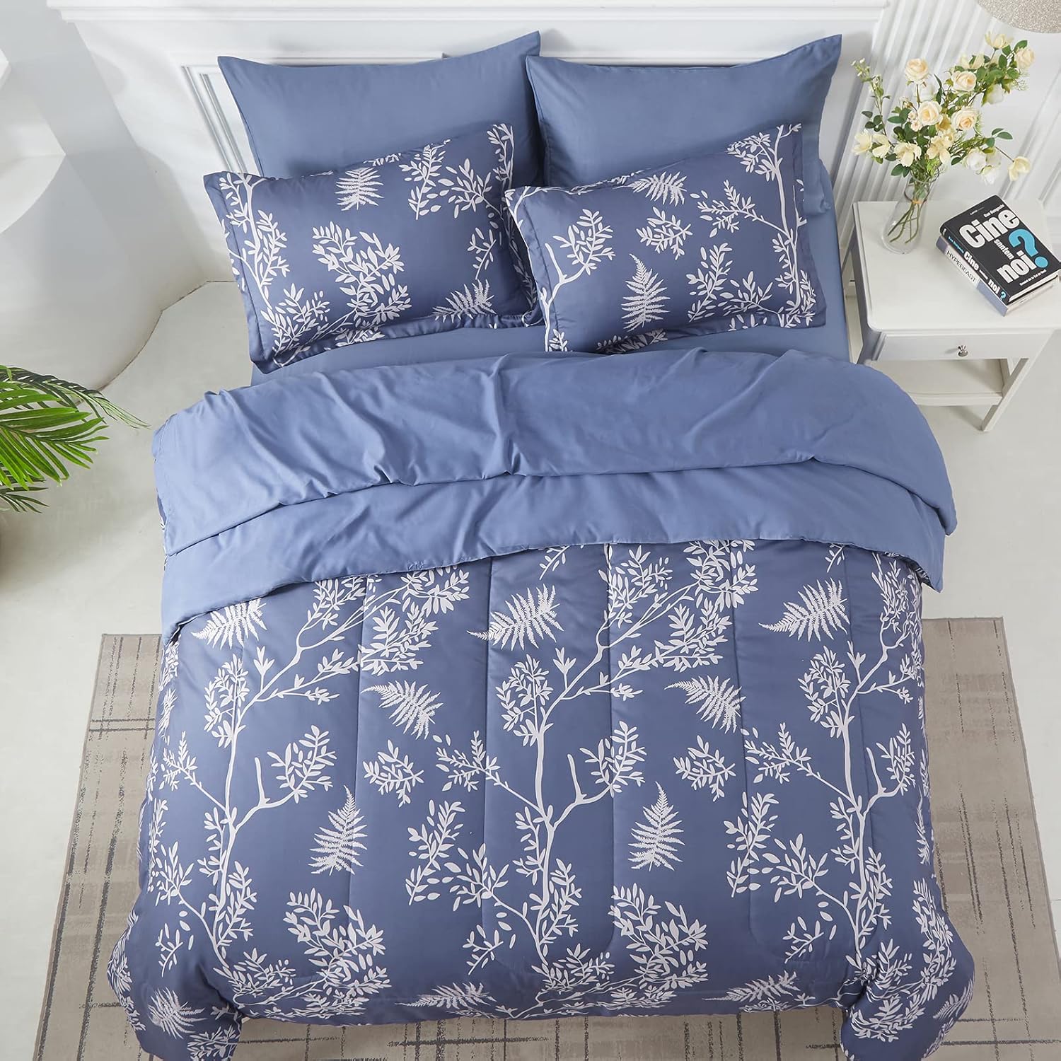 Yogeneg Botanical Queen Comforter Set,7 Piece Bed in a Bag,White Floral Leaves Print on Blue Reversible Design,Soft Microfiber Bedding Complete Set for All Season(Blue,Queen)