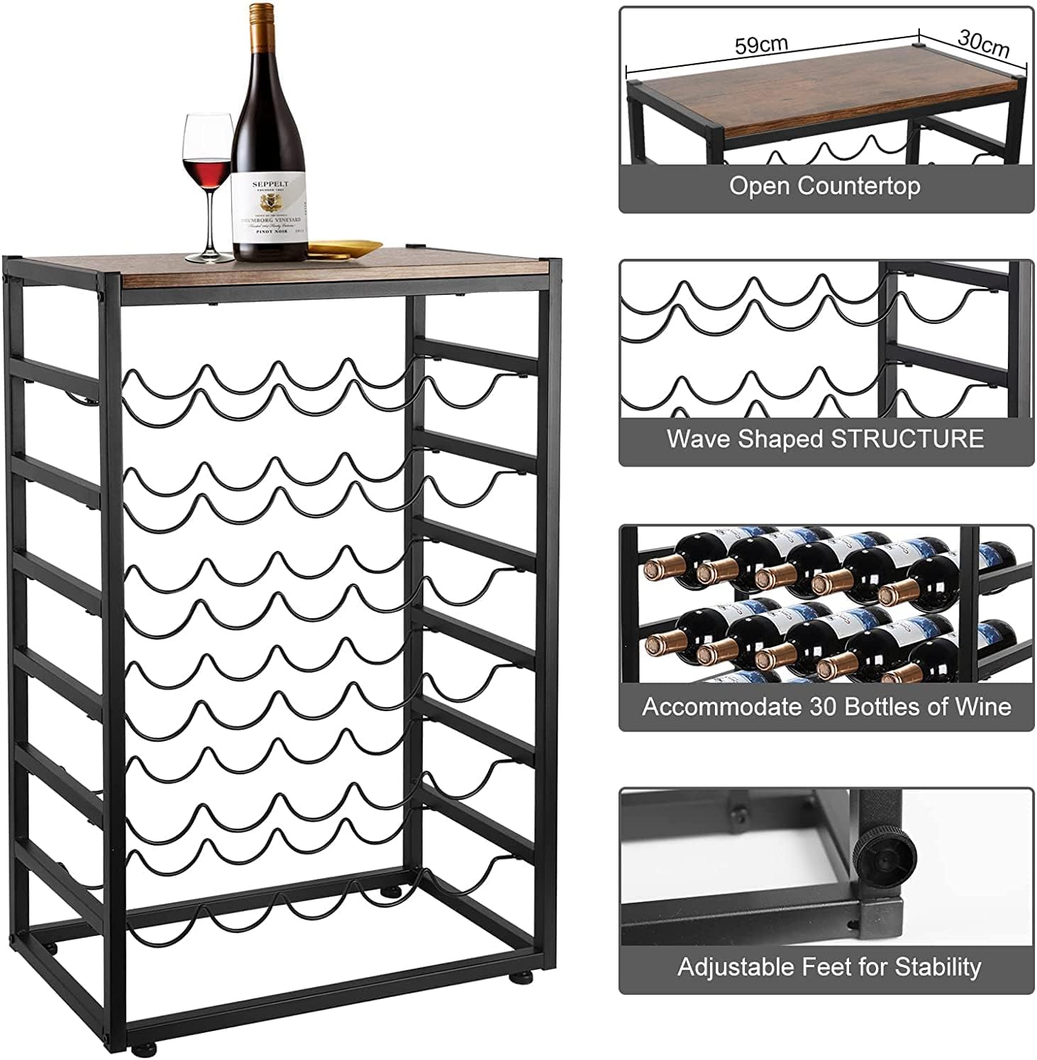 🍷STABLE CONSTRUCTIONS: Made of well-finished iron frame and quality particle board, this wine rack has great sturdiness which ensures stability and durability. Adjustable feet make the wine bottle holder more stable and won’t scratch your floor.