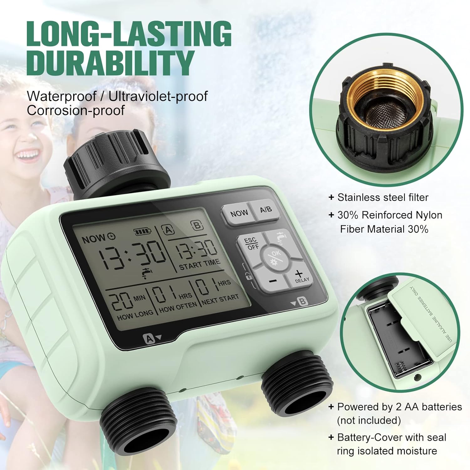 Yomile Sprinkler Timer, Programmable Water Timer with Rain Delay/Manual/Child Lock Automatic Irrigation System Hose Timer for Garden Faucet (Dual Outlet) (Light Green)