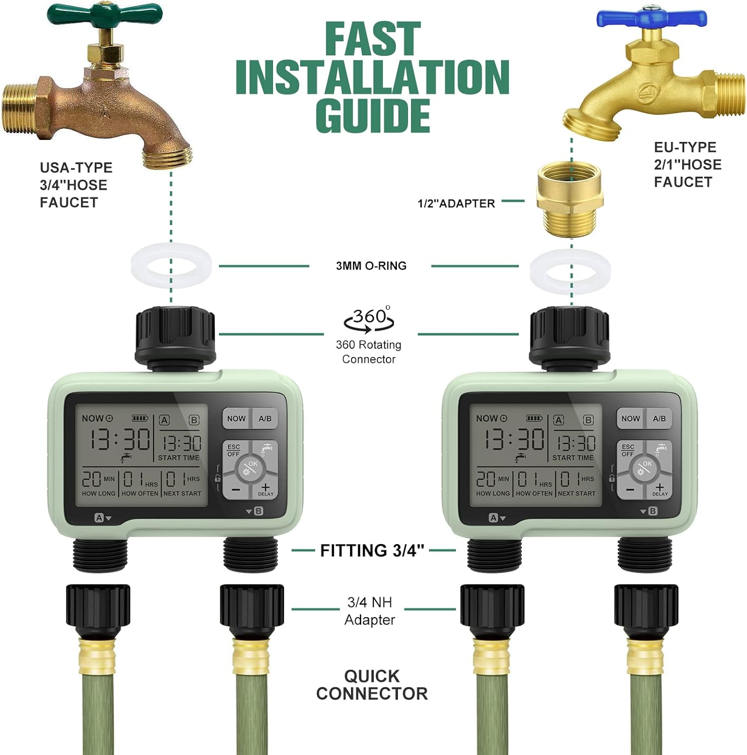【Waterproof and Durable】To ensure long-lasting lifespan, our garden timer is designed with heavy-duty construction, made of IPX5 waterproof, anti-UV coating and anti-rust materials; adding a seal ring on the battery cover to isolate moisture which is perfect for outdoor using.