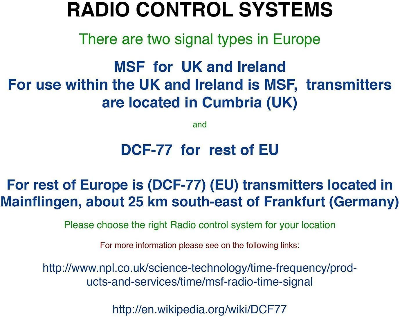 Youshiko brings to you Radio Controlled Silent Large LCD Wall Clock (Official UK & Ireland Version) that is designed to display accurate time, without having the need to interfere during seasonal changes, Automatic time change for Spring & Autumn and automatic time, Self Set Automatically , You never have to do any thing. This sturdy wall clock displays time in 12/24h format and in hours, minutes and seconds. In addition to this, the clock displays date, month, weekday, indoor temperature in centigrade or Fahrenheit, and moon phase. These readings are displayed in a precise and easy to read format that is clearly visible even from a distance. This clock does not have a backlight to avoid any disturbance during night time. This LCD clock also comes with an alarm with snooze function. This rectangular wall clock has dimensions 23 x 16 x 2.5 cm and can be easily placed on a table top or mounted on your wall as per your convenience. This clock is ideal for home or workspace and perfect for public buildings, warehouses, shops, restaurants, factories, banks, schools, indoor sports halls, offices etc. where consistently accurate time is needed. There are two RC signals types in Europe, The MSF signal is used within the UK and Ireland and the transmitters are located in Cumbria (UK) . For the rest of Europe, the DCF-77 is used where the transmitters are located in Mainflingen, about 25km south-east of Frankfurt (Germany). The MSF radio signal is a dedicated standard-frequency and time broadcast that provides an accurate and reliable source of UK civil time. DCF77 is a German longwave time signal and standard frequency radio station and the station signal carries an amplitude-modulated, pulse-width coded 1 bit/s data signal. This Jumbo LCD Radio controlled wall clock will always show the correct time as it is constantly receiving the MSF UK atomic clock radio timing signal 12/24 h time display Hours, minutes and second display Date, Month & weekday display Indoor Temperature in Centigrade or Fahrenheit and Moon Phase Alarm with snooze function Wall mounting or Table standing SPECIFICATIONS Clock Dimensions : 23 x 16 x 2.5 cm Batteries required : 2 x AA (not included), this clock works with batteries only A highlighting feature of this wall clock from Youshiko is that it always shows the correct time as it is constantly receiving the MSF UK atomic clock radio timing signal. The timing is accurate to 1 second in 10 million years and the clock has automatic set up for time and calendar (where applicable). The National Physical Laboratory (NPL) is the UK’s home of measurement and the nation’s timekeeping. NPL is responsible for operating the national time system and making accurate time available across the UK. This clock keeps accurate time by picking up the NPL’s radio signal, called MSF, which is transmitted on 60KHz from Cumbria. This transmission carries a date and time code that the radio-controlled products use to set themselves to the correct time. The signal is controlled by atomic clocks at the radio station and is adjusted to keep in step with the national time maintained at NPL laboratory in London
