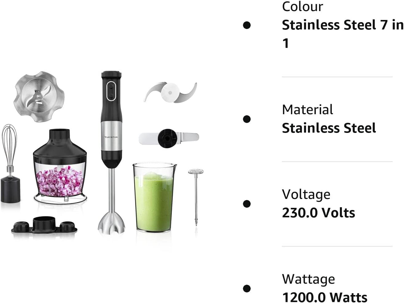 Whisk With this whisk beat egg whites and cream faster, can prepare cakes, biscuits and other dessert ingredients. Milk Frother Perfect whip coffee using milkfrother ,like cappuccino 、latte、mocha、macchiatto!So you can spend more time enjoying the things you love! 500ML Food Chopper Chop meat,onion and vegetables,ideal for making pasta sauce, meat sauce, pizza, smooth sausage. It can also for soup, baby food, pies, etc 600ml Measuring Cup Perfect for blending smoothies, creamy soups, chopping veggies, and even making eggs or a dressing. You can get 20 different speed by press the turbo button with different strength to different food you want to make Ice crushing Salsa Sauce Squeeze Juice Prepare Baby Food Make Smoothie DIY Cake Liquid Food Chop Meat,Onion and Vegetables Do not immerse the motor unit in water. Blades are sharp. Be carefully. Please read the user manual carefully before use. Overheating Protection :The temperature of the motor would rising when we keep running it to blend a lot of solid food such as malt dust, nuts etc for over 2 minute. The motor would getting hot, the thermostat would stop the motor as overheating protection, and then when it chilled off(within few minutes), the blender can operate again and work fine. 【Powerful and Sufficient 800-watt Motor】Yumystori hand blender is equipped with a high performance Rated 800W motor (Max Up to 1200W) and innovative ice crush blades that made of stainless steel materials, which is durable and ideal for efficiently chopping hard ingredients such as nuts and meat, 14000RPM speed can break foods instantly, for making a glass of juice just need 19S. Easy mixed mayonnaise, soup, sauce, baby food, even smoothies. Effectively reducing food preparation time. Customers like the ease of use, attachments and size of the food blender. For example, they mention it’s simple to use for various purposes, easy to assemble and that it saves them time. They appreciate the variety of attachments, saying it’ll make blending different foods a breeze. That said, some complain about the performance, saying the whip is small and the blender head is too big. Opinions are mixed on quality. AI-generated from the text of customer reviews
