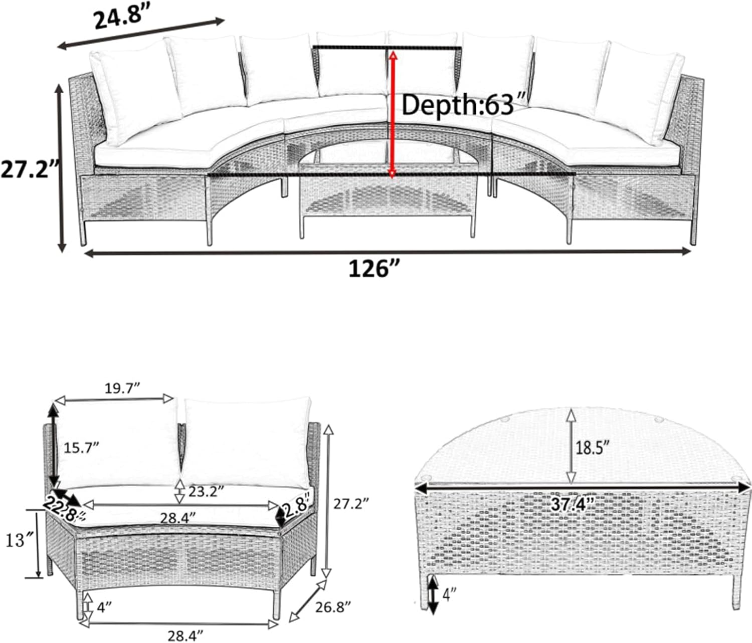 Tempered Half-moon Glass Table: 37.4×18.5x13inches(LXWXH). Each Sofa: 47.6×26.8×27.2inches(LXWXH).Cushion:47.6×23.2×2.8inch(LXWXT). Pillow: 19.7×15.7×7.9inch(LXWXT).