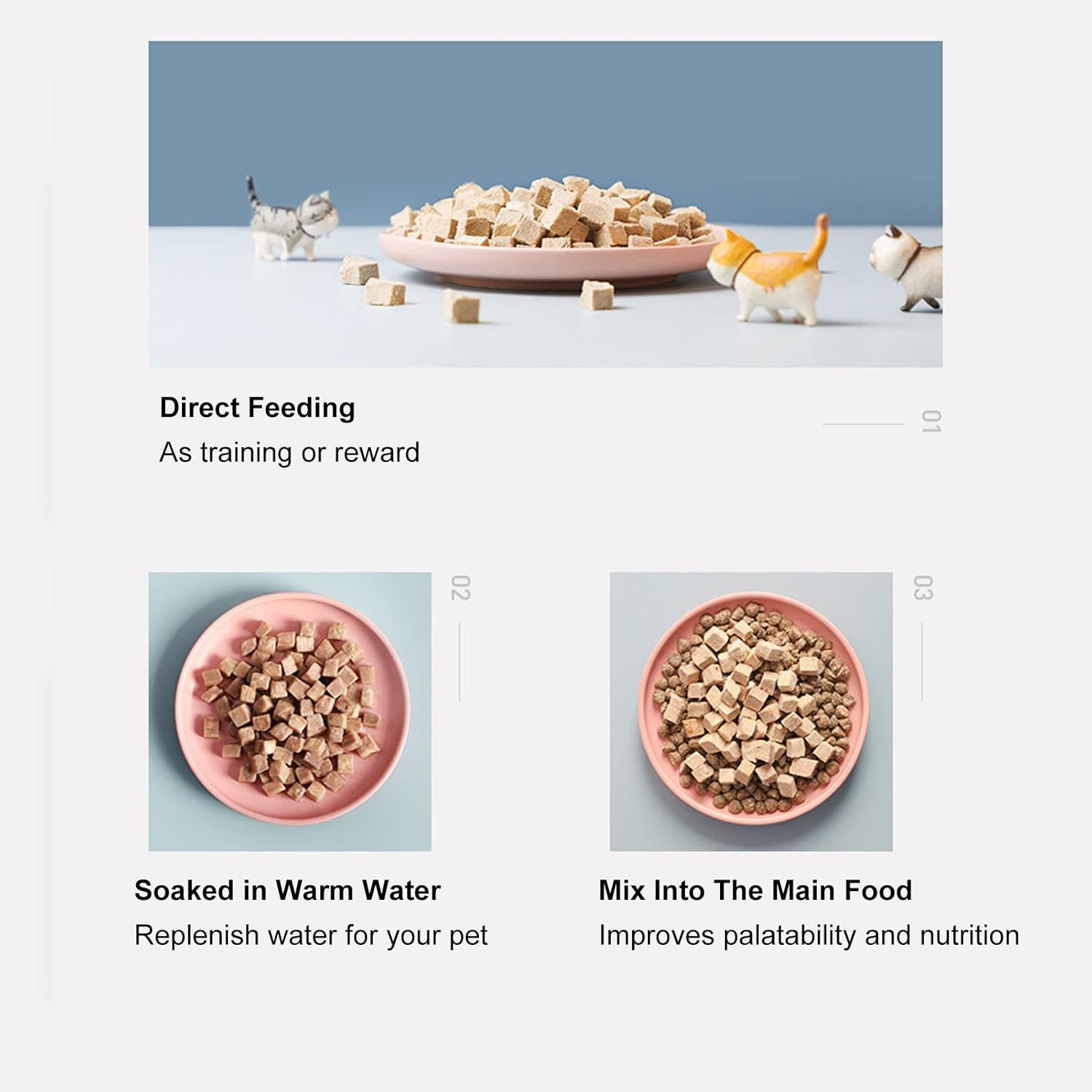 [Various Feeding] Freeze dried chicken livers can be fed directly as a training or reward treat, soaked in warm water for hydration, or mixed into the main food for a balanced nutrition.