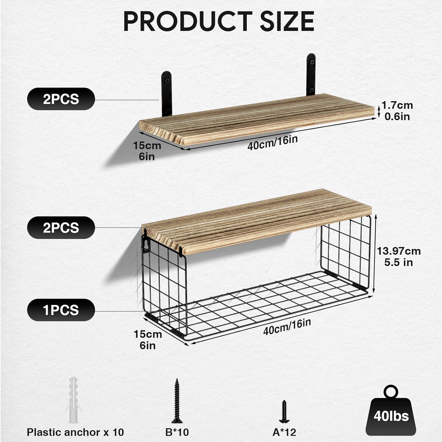 ✅ 【PACKAGE INCLUDES】 Size: 41cm/16in x 15cm/6in x 1.7cm/0.6in Wooden boards x 2, L-shaped metal brackets x 2, wire storage baskets x 1, long nails x 10, plastic anchors x 10, short nails x 12